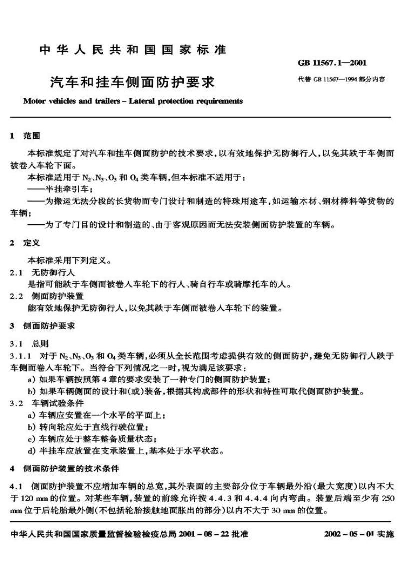 GB11567.1-2001前言本标准全部技术内容为强制性要求。本标准仅对GB11567一1994《汽车和挂车侧面及后下部防护装置要求》中有关侧面防护装置的内容进行了修订。本标准等同采用了联合国欧洲经济委员会(ECE)1988年2月29日发布的ECER73《关于就侧面防护装置方面批准载货车、挂车和半挂车的统一规定》的全部技术内容。本标准与GB11567一1994的主要差异有:①对侧面防护装置的形状和侧面防护装置在车辆横向位置的要求比GB11567一1994更为具体、详细。②对侧面防护装置前端的结构和位置要求重新进行了规定。③对侧面防护装置后端的位置限值进行了调整。④对侧面防护装置距车辆上部的距离要求进行了调整和完善。⑤对侧面防护装置的构成,增加了不允许侧面防护装置作为制动元件、气体或液体管路的要求。⑥增加了对特种车辆的补充规定。本标准自实施之日起,替代GB11567-1994中有关侧面防护装置的内容。本标准由国家机械工业局提出。本标准由全国汽车标准化技术委员会归口。本标准起草单位:中国汽车技术研究中心、长春汽车研究所。本标准主要起草人:朱彤、朱西产、崔光滨。本标准委托全国汽车标准化技术委员会负责解释。本标准首次发布于1989年,1994年第一次修订,本次为第二次修订。