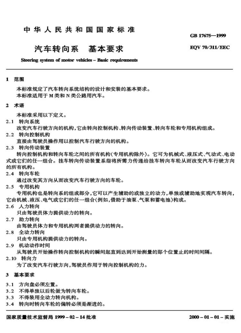 GB17675-1999前言本标准等效采用70/311/EEC《各成员国关于汽车及其挂车转向机构的协议》。只是按中国标准编写的习惯,将试验条件的内容分列出来,并增加了“机动动作时间”的定义。本标准还增加了日本安全标准第11条的内容和GB7258一1997《机动车运行安全技术条件》中有关转向的规定。本标准由国家机械工业局提出。本标准由全国汽车标准化技术委员会归口。本标准由中国汽车技术研究中心负责起草。本标准起草人:姜璧琪。本标准由全国汽车标准化技术委员会负责解释。