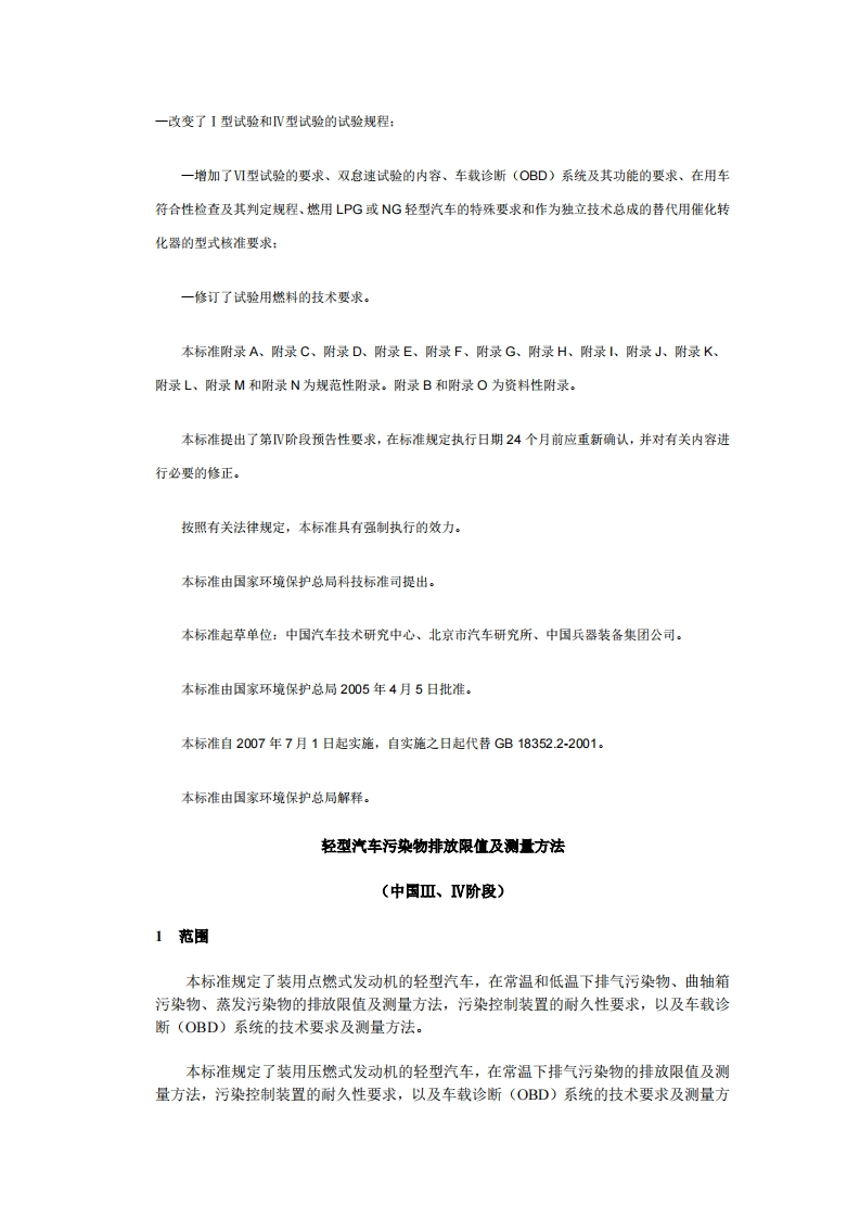 轻型汽车污染物排放限值及测量方法(中国Ⅲ、V阶段)Limits and measurement methods for emissions from light-duty vehicles(III,IV)(GB18352.3-20052007-07-01实施)2007-07-01前言为贯彻《中华人民共和国环境保护法》和《中华人民共和国大气污染防治法》,防治机动车污染物排放对环境的污染,改善环境空气质量,制订本标准。本标准修改采用欧盟(EU)对0/220/E正C指令《关于协调各成员国有关采取措施以防止机动车排放污染物引起空气污染的法律》进行修订的9869/EC指令《修订70220/EEC指令关于协调各成员国有关采取措施以防止机动车污染物引起空气污染的法律》以及随后截止至200376EC的各项修订指令的有关技术内容。本标准与上述欧盟指令相比,主要修改内容:一M1和M2类车型的分组:一燃料的技术要求:一将原Ⅱ型试验修改为双怠速试验:一实施时间:一参照经2001116/EC修订的70/156/EEC指令《关于协调各成员国有关机动车及其挂车型式认证的各项法律》附件X的内容,增加了附录M“生产一致性保证要求”。本标准规定了轻型汽车污染物排放第Ⅲ阶段和第V阶段型式核准的要求、车辆生产致性和在用车符合性的检查和判定方法。本标准也规定了燃用LPG或NG轻型汽车的特殊要求。本标准也规定了作为独立技术总成、拟安装在轻型汽车上的替代用催化转化器,在污染物排放方面的型式核准规程。本标准与GB18352.2-2001相比主要变化如下:一加严了排放限值: