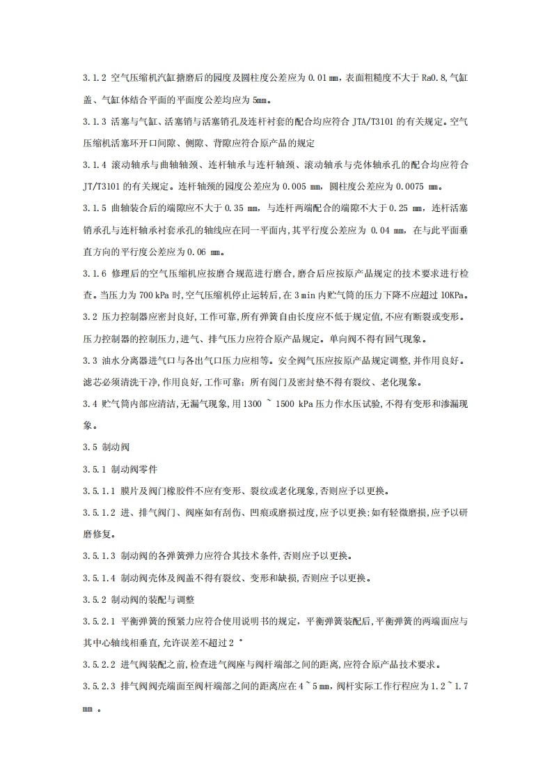 车制动传动装置修理技术条件气压制动GB/T18275.1-2000本标准规范了汽车制动传动装置修理后应达到的技术要求,使修理后制动能量能够顺利有效地提供给制动器,确保制动安全可靠。为加强汽车修理行业技术管理提供依据。本标准主要依据JT/T3101-1981《汽车修理技术标准》及相关汽车修理技术国家标准,结合我国多年来汽车制动传动装置的修理实践,并参考修理企业标准编制而成:本标准分成《汽车制动传动装置修理技术条件气压制动》和《汽车制动传动装置修理技术条件-一液压制动》两个分标准。本标准由中华人民共和国交通部提出。本标准由全国汽车维修标准化技术委员会归口。本标准负责起草单位:交通部公路科学研究所。本标准参加起草单位:南京市汽车维修管理处。本标准主要起草人:周天佑、徐通法。本标准委托交通部公路科学研究所负责解释。1.范围本标准规定了汽车气压传动装置修理的基本技术要求、试验方法和检验规则。本标准适用于汽车气压传动装置的修理。2.引用标准下列标准所包含的条文,通过在本标准中引用而构成为本标准的条文。本标准出版时,所示版本均为有效。所有标准都会被修订,使用本标准的各方应探讨使用下列标准最新版本的可能性。JT/T3101?981汽车修理技术标准QC/T35?992汽车与挂车气压控制装置台架实验方法QC/T36?992汽车与挂车气压控制装置通用技术条件3技术要求3.1空气压缩机3.1.1空气压缩机汽缸体的形位公差应符合原产品的规定。汽缸磨损超过分级理尺寸时应予镶套。
