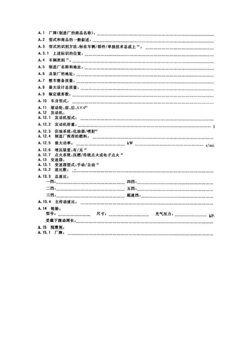 前言本标准与联合国欧洲经济委员会(EE)1997年1月1日生效的ECER101一00法规《就二氧化碳排放量和撼料消耗量对装内燃机乘用车认正的统一规定》的一致性程度为非等效,取消了该法规中不适用的管理性内容,并将该法规中的附录2“通知书”的内容改写为本标准的附录A“型式试验结果报告”。此外,参考了欧盟(EU)2004年11月2日生效的2001/3/EC指令《机动车的二氧化碳排放量和燃料请耗量》中的有关适用范区、试验循环和认正扩展方面的内容。本标准的适用范围除ECER10100法规规定的M:类车辆外,也适用于,类车领和最大设计总颜量不超过3500kg的1类车钙。本标准虽然将ECER101一00法规中作为型式认正值和生产一致性检查内容的C⑦,均改为攒料消耗量(F),但在测得撼料消耗量的同时,也应测得并记录C0排放量。本标准代替GB/T19233一2003《轻型汽车燃料清耗量试验方法》的全韶内容。本标准与GB/T19233一2003相比,主要变化如下:一一更正了前言中参凰的ECER101的版本。将第1章的规定内容增加了“生产一致性的检查和判定方法”:适用范围改为“是、N和最大设计总质量不超过3500kg的麓车希。”并汽定了“本标准不适用于不能燃用汽油或柴油的车有”。一一第2章增加了GB18352.3一2005《轻型汽车污桑物排放限值及测量方法(中国、V阶段)》作为规范性引用文件。一一第4章增加了4,1:“在进行然料消耗量型式试验前,制造厂或其没权代理者应申报被试车型的市区、市郊和嫁合燃料消耗量氧。”一一第4章增加了4.2:“对于实施GB18362.3一2005的车辆的试验内容参凰该标准执行:其他车辆参照GB18362.2-2001执行。”一一第4章增加了4.3:“制造厂或其授权代理者应将一辆代表被试车型的车辆提交给负责型式试验的检验机构。在试验期间,检验机构应技照相应排放标准检查此车椠的津放状况,它应符合凌车型相应排放标准的限值要求。”一一原4.1改为4.4:“按照GB18352.3一2005或GB18352.2一2001中附录C附件CA中所述的模市区和市郊行破工况的试验循环,测量C0、00和HC的排放量。”一一原4.2改为4.5:“00、C0和HC的排放测试结果用克每千米(g/八m)表示,C0值圆整(四舍五入)至整数位。”一一原4.3改为4.6一一原4.4改为4.7,内容中强调了型式认正试验时禁止使用添加含氧物的燃料。一一参照2004/3/C指令,6.1增加了:“如果车辆不能达到试验循环要求的加速和最大车速值,则应将却速踏板踏到底,直至回到要求的运行由线。偏离试验循环的情况应在试验报告中记载。”一一为使行驶阻力的设定更符合实际,6.2内容更改为:“型式认证试验时,应技GB18352.3一2005或GB18352.2一2001中CC,5.1的规定确定车辆的行驶阻力。如行驶阻力由线由车辆制造厂提供,需要瓦时提俱试验报告、计算报告或其他泪关资料,并由检歌机构确认。如车钢制造厂提出要求,行驶阻力可以按GB18352.3一2005或GB18352.2一2001中表CB.1选定,仲线试验时,应按GB18352.3一2005或GB18352.2一2001中CC5.1规定确定车氧的行驶阻力。”一一增加了7.2,1“对于非型式试验或非生产一致性试验且没有使月基准燃料时燃料消耗量计算值的修正”,其中7.2.1.1:“如果使用燃料的氢-碳不是因定值,允许进行修正”,并给出修正办法:7.2.1.2:“如果使用了乙醇汽油E10或添加了10%以上甲基教丁基酸(MTBE)的汽油,且试验计算中已考虑了氧对燃料中碳比例的影响和燃料密度的变化,计算得到的燃料消耗量可以分别乘以97或98%作为计算值。”一一7,3增加了M:类和凡类车锈的允差,并明确了确定型式认正值时的允差,