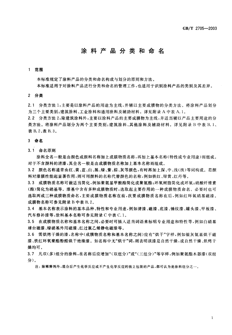 GB/T2705-2003前言本标准代替GB/T2705一1992《涂料产品分类、命名和型号》。本标准与GB/T2705一1992相比主要技术差异如下:一提出两种分类方法:增加了以涂料产品用途为主线并适当辅以主要成膜物分类方法(分类方法1):补充完善了以主要成膜物为基础的分类方法,适当辅以产品的主要用途,并将建筑涂料重点突出出来(分类方法2)。—取消了涂料产品的型号。本标准的附录A和附录B为规范性附录,附录C为资料性附录。本标准由中国石油和化学工业协会提出。本标准由全国涂料和颜料标准化技术委员会归口。本标准主要起草单位:中国化工建设总公司常州涂料化工研究院。本标准主要起草人:唐瑛、赵玲、冯世芳。本标准于1981年首次发布,1992年第一次修订。