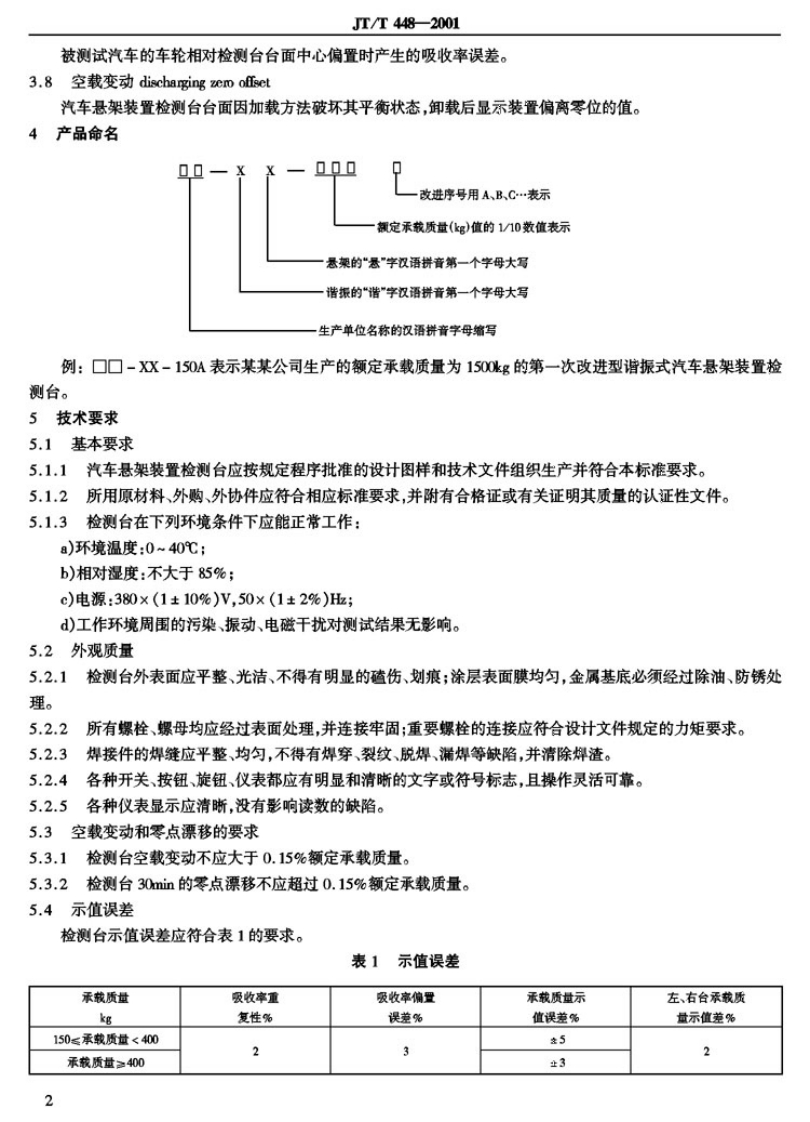 中华人民共和国交通行业标准汽车悬架装置检测台JT/T448-2001Automotive suspension tester范围本标准规定了谐振式汽车悬架装置检测台的产品命名、技术要求、试验方法、检验规则和标志、包装、运输、贮存。2引用标准下列标准包含的条文,通过本标准中引用而成为本标准的条文。在标准出版时,所示版本均为有效。所有标准都会被修订,使用本标准的各方应探讨使用下列标准最新版本的可能性。GB191-2000包装储运图示标志GB/个2681-1981电工成套装置中的导线颜色GB/T2682-1982电工成套装置中的指示灯和按钮的颜色GB9969.1-1988工业产品使用说明书总则GB/T12534-1990汽车道路试验方法通则GBT13306-1991标牌GB/T13384-1992机电产品包装通用技术条件3定义本标准采用下列定义。3.1谐振式汽车悬架装置检测台resonant-automotive8 uspension tester通过机械激振使汽车悬架系统产生谐振的方法来测定汽车悬架装置性能的检测装置。3.2额定承载质量rated load mass汽车悬架装置检测台能够承受的最大汽车轴质量。3.3起始激振频率beginning excited vibrant froquency检测台驱动电机启动后,飞轮的稳定转速对应的频率,它是机械激振扫频过程中的最高频率。3.4静态车轮垂直接地力static-vertical wheel contact force汽车悬架装置检测台面与被测汽车悬架装置处于静止状态时,汽车车轮作用在台面上的垂直作用力。3.5动态车轮垂直接地力dynamic-vertical wheel contact force汽车悬架装置检测台面与被测汽车悬架装置的车轮部分出现共振时,汽车车轮作用在台面上的垂直作用力。3.6吸收率absorptivity被测汽车最小的动态车轮垂直接地力与静态车轮垂直接地力之比,以百分数表示(%)。3.7吸收率偏置误差offsetting error of absorptivity中华人民共和国交通部2001-08-30批准2001-12-01实施