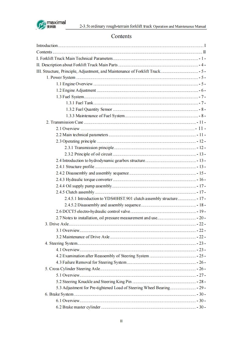 maximal美科断2-3.5t ordinary rough-terrain forklift truck Operation and Maintenance ManualIntroductionThis manual main introduces the items in the aspects of performance,structure,andoperation,as well as maintenance and service,etc of the ordinary rough-terrain forklift trucks,sothat the operators are able for a correct use and maintenance.During the user operating process,the operators and equipment management personalinvolved shall carefully follow the relevant regulations of this manual,for the forklift truck tomaintain its good technical conditions.