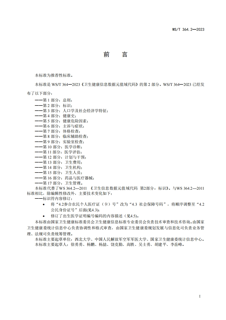 卫生健康信息数据元值域代码-第2-部分_标识-Coding-for-value-domain-of-health-data-element-Part-2_-Identification348072@abc19天前发布关注私信0.17MB4页047卫生健康信息数据元值域代码-第2-部分_标识-Coding-for-value-domain-of-health-data-element-Part-2_-Identification此内容为付费资源,请付费后查看¥39¥49黄金会员免费钻石会员免费立即购买您当前未登录!建议登陆后购买,可保存购买订单付费资源 第1页 / 共4页 第2页 / 共4页 试读已结束,还剩2页,您可下载完整版后进行离线阅读 THE END说明书手册 文本预览 1CS11.020CCS C07WS中华人民共和国卫生行业标准WS/T364.2-2023代替WS364.2-2011卫生健康信息数据元值域代码第2部分:标识Coding for value domain of health data element-Part 2:Identification2023-10-07发布2024-04-01实施中华人民共和国国家卫生健康委员会发布 查看更多 收起部分 喜欢就支持一下吧收藏