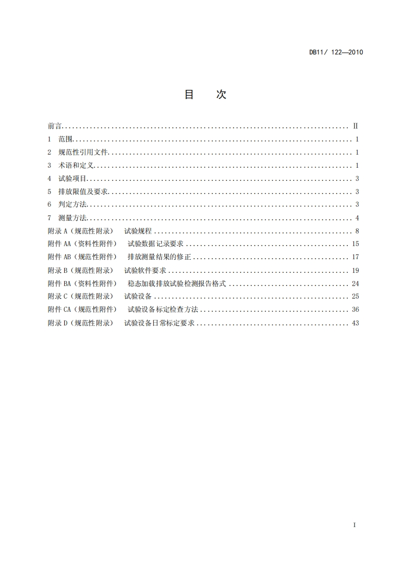 1CS13.040.50Z64备案号:27288-2010DBI1北京市地方标准DB11/122—2010代替DB11/122一2006在用汽油车稳态加载污染物排放限值及测量方法Limits and measurement methods for exhaust pol lutants from in-usegasol ine vehicles under steady-state loaded mode2010-02-04发布2010-06-01实施北京市环境保护局发布北京市质量技术监督局