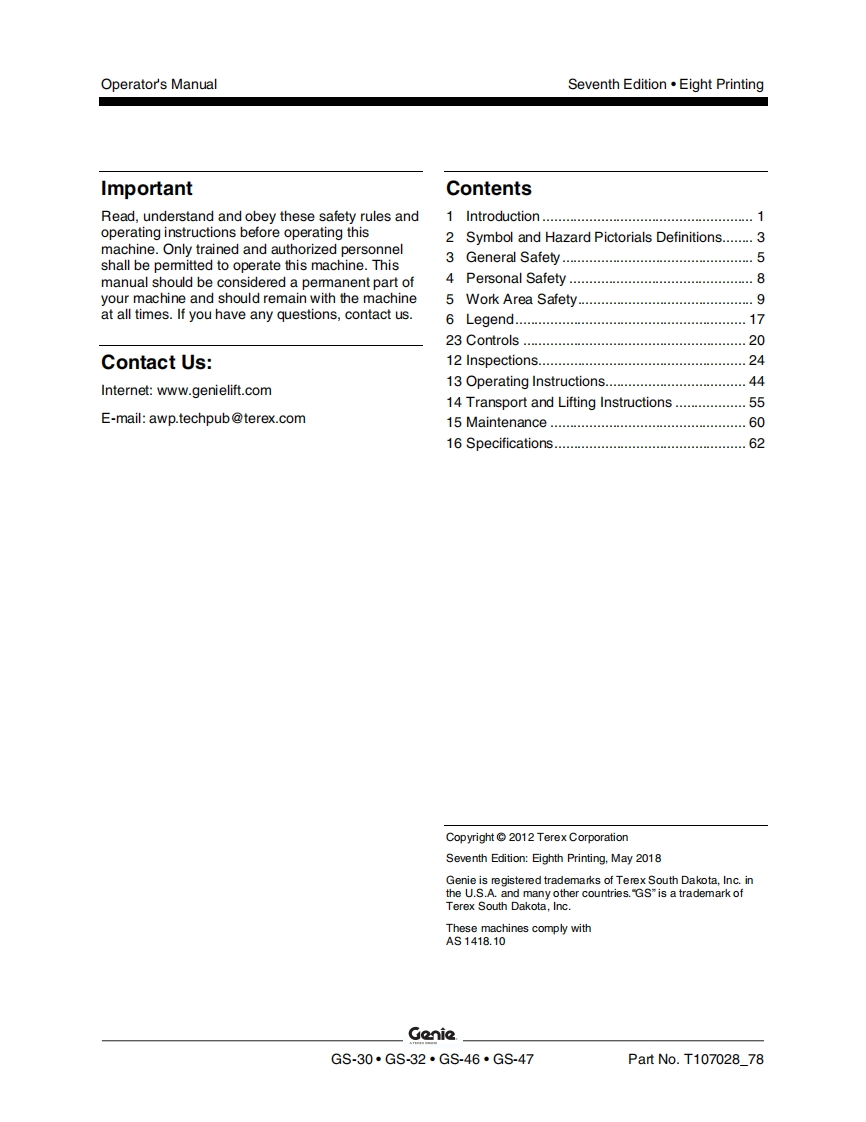 GenieA TEREX BRANDOperator's ManualSerial Number RangeGS-1530/32from GS3010A-110000AUSfrom GS3011C-10000from GS3014D-101AustraliaGs-1930/32from GS3010A-110000from GS3011C-10000from GS30140-101GS-2032from GS32114110000from GS3212C-10000GS-2632from GS3211A-110000from GS3212C-10000GS-3232from GS32114110000from GS3212C-10000GS-2046from GS4612A-110000withfrom GS4612C-10000from GS4616D-101MaintenanceGS-2646Informationfrom GS4612A-110000from GS4612C-10000from GS4616D-101GS-3246from GS4612A-110000from GS4612C-10000from GS4616D-101GS-4047from GS4712C-101from GS4716D-101Seventh EditionEighth PrintingPart No.T107028