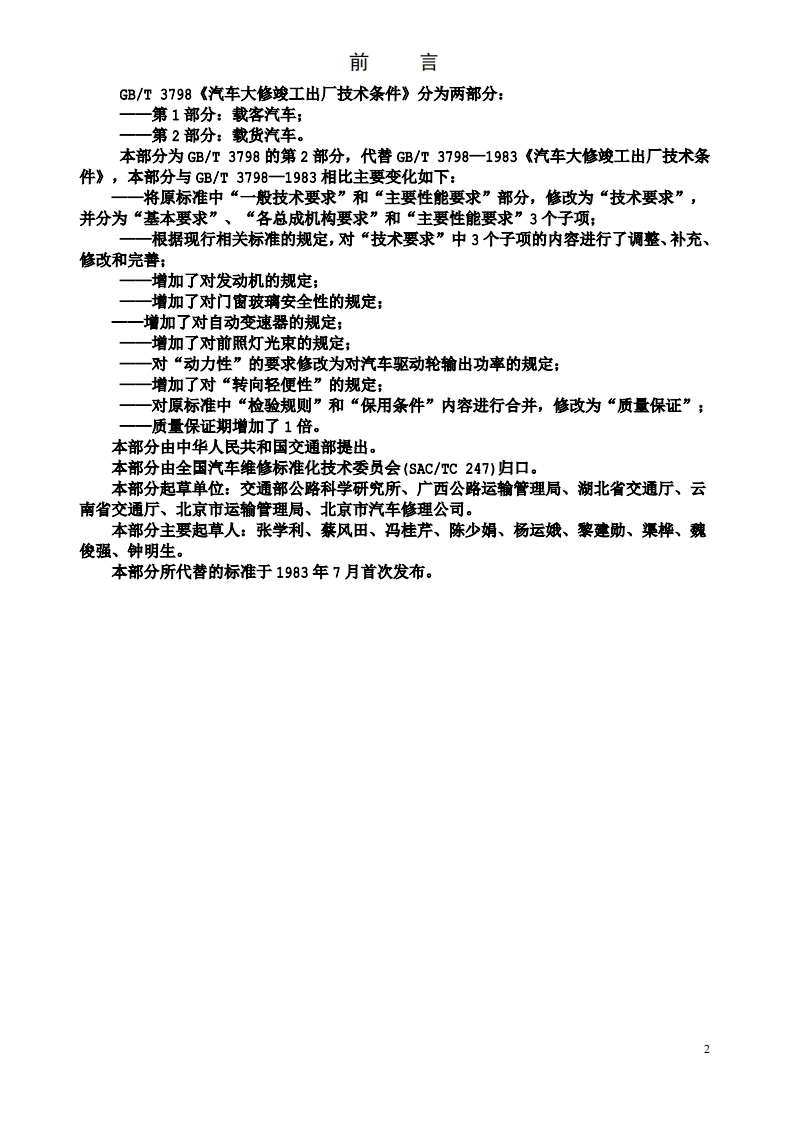 ICs43.180R16GB中华人民共和国国家标准GB/T3798.2-2005代替GB/T3798-1983汽车大修竣工出厂技术条件第2部分:载货汽车Technical requirements for completion and acceptance of vehicleOverhaul-Part 1:Goods vehicle2005-03-21发布2005-08-01实施中华人民共和国国家质量监督检验检疫总局中国国家标准化管理委员会发布