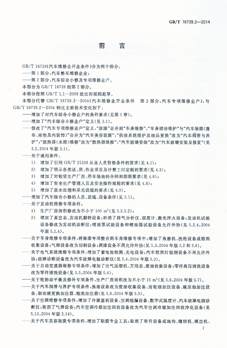 ICS43.180R16中华人民共和国国家标准GB/T16739.2-2014代替GB/T16739.2-2004汽车维修业开业条件第2部分:汽车综合小修及专项维修业户Certification requirements for motor vehicle maintenance and repair enterprise-Part 2:Motor vehicle comprehensive current repair and maintenance andrepair of special items2014-09-03发布2015-01-01实施中华人民共和国国家质量监督检验检疫总局中国国家标准化管理委员会发布、诊候金真可