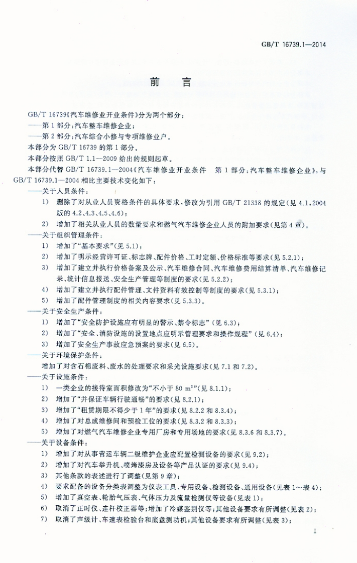 ICS43.180R16中华人民共和国国家标准GB/T16739.1-2014代替GB/T16739.1-2004汽车维修业开业条件第1部分:汽车整车维修企业Certification requirements for motor vehicle maintenance and repair enterprise-Part 1:Motor vehicle maintenance and repair2014-09-03发布2015-01-01实施中华人民共和国国家质量监督检验检疫总局中国国家标准化管理委员会发布