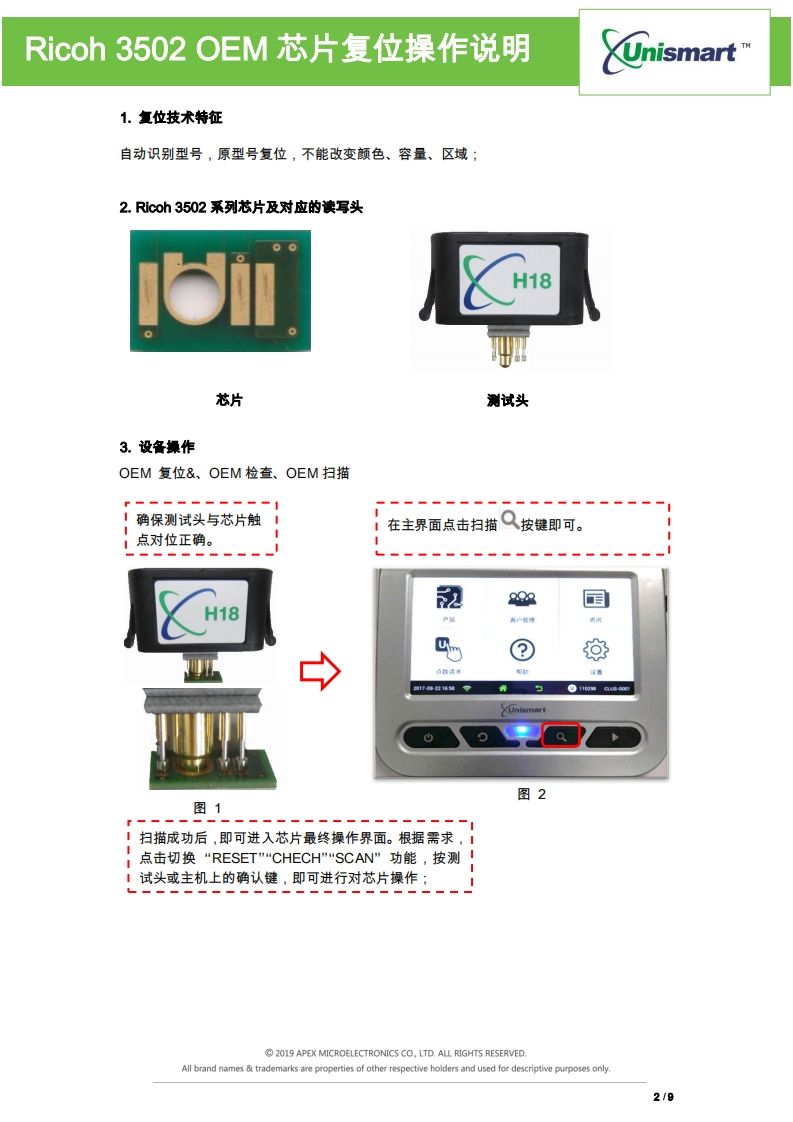 Ricoh3502OEM芯片复位操作说明☑InismartUni Ricoh 3502OEM芯片复位操作说明V1.0目录1、复位技术特征.22、Ricoh3502芯片及对应的读写头23、设备操作.…。.24、复位注意事项.….35、代码提示及具体含义.46、型号对照表.错误未定义书签。2019 APEX MICROELECTRONICS CO,LTD.ALL RIGHTS RESERVED.All brand names trademarks are properties of other respective holders and used for descriptive purposes only119