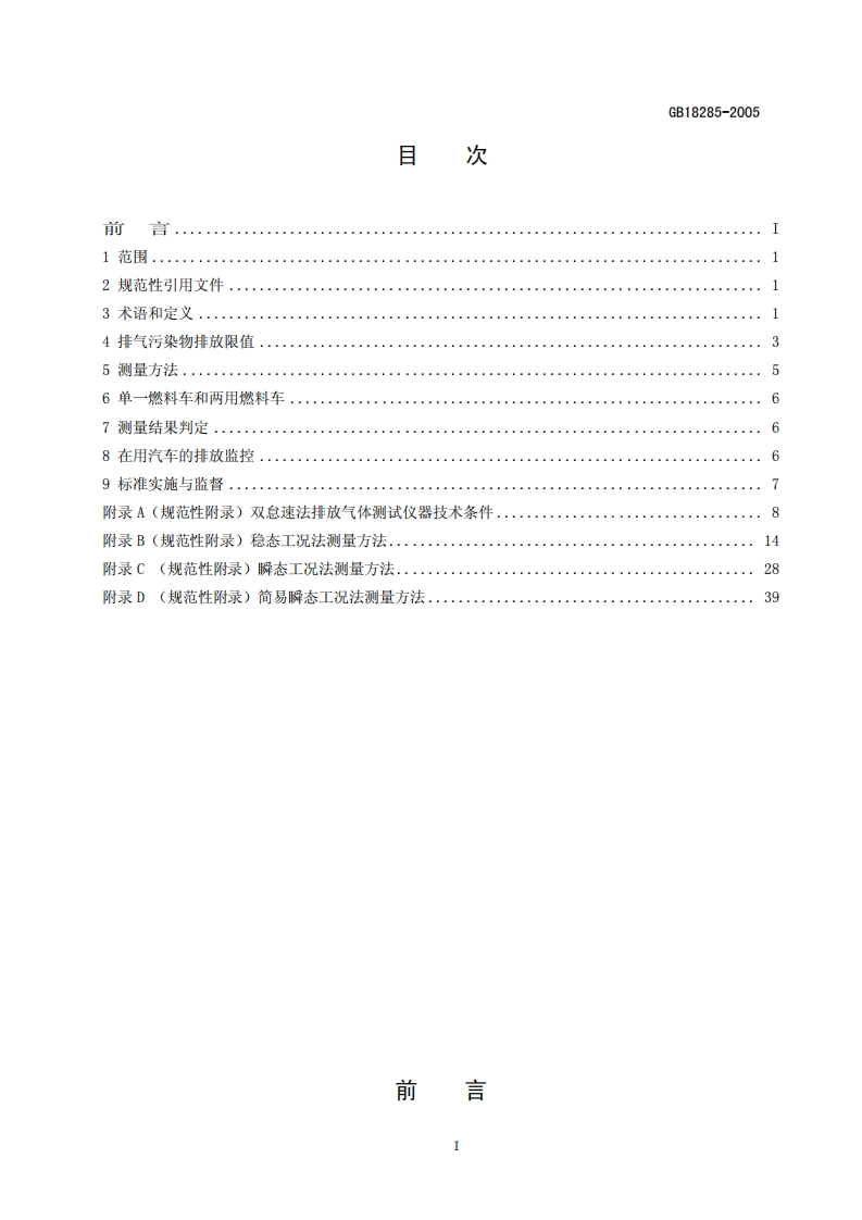 本电子版内容如与中国环境出版社出版的标准文本有出入,以中国环境出版社的文本为准。GB中华人民共和国国家标准GB18285-2005代替GB14761.5-93、GB/T3845-93部分代替GB18285-2000点燃式发动机汽车排气污染物排放限值及测量方法(双怠速法及简易工况法)Limits and measurement methods for exhaust pollutantsfrom vehicles equipped ignition engine under two-speed idleconditions and simple driving mode conditions(发布稿)2005-06-07发布2005-07-01实施国家环境保护总局发布国家质量监督检验检疫总局SEPAVehicle Emission Control Center