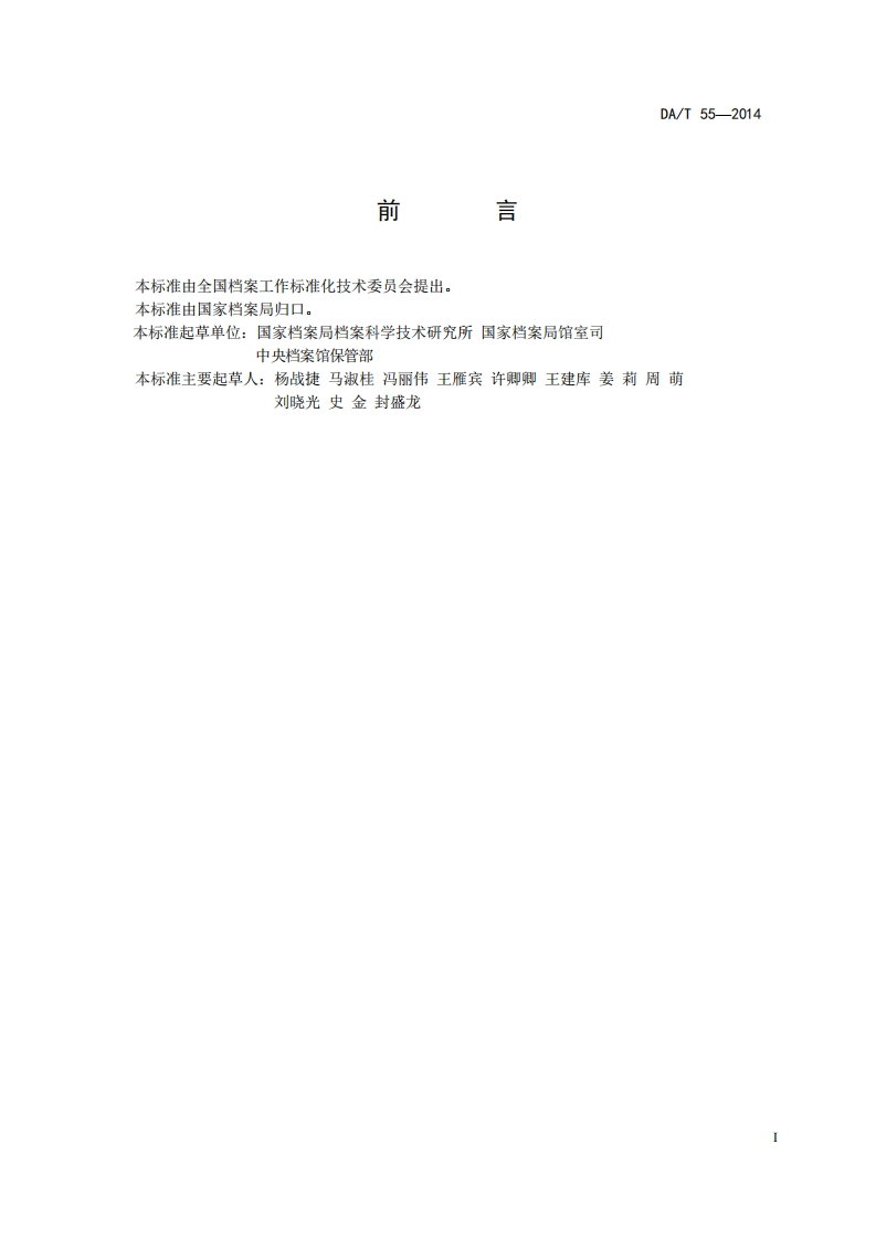 特藏档案库基本要求-Basic-requirements-of-the-vault-for-vital-archives348072@abc17天前发布关注私信0.42MB6页036特藏档案库基本要求-Basic-requirements-of-the-vault-for-vital-archives此内容为付费资源,请付费后查看¥39¥49黄金会员免费钻石会员免费立即购买您当前未登录!建议登陆后购买,可保存购买订单付费资源 第1页 / 共6页 第2页 / 共6页 试读已结束,还剩4页,您可下载完整版后进行离线阅读 THE END标准规范 文本预览 Cs01.140.20A14备案号:48935-2015DA中华人民共和国档案行业标准DA/T55-2014特藏档案库基本要求Basic requirements of the vault for vital archives2014-12-31发布2015-08-01实施国家档案局发布 查看更多 收起部分 喜欢就支持一下吧收藏