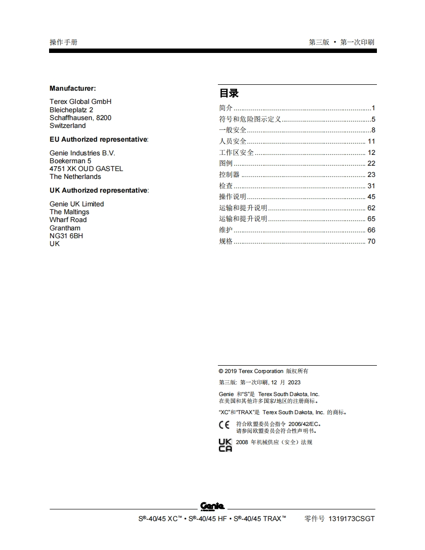 GENIE吉尼—40-XC™-S-45-XC_—-40-HF—45-HF—40-TRAX–45-TRAX-序列号范围_1曲臂吊高空作业平台操作说明书手册348072@abc20天前发布关注私信3.28MB84页035GENIE吉尼—40-XC™-S-45-XC_—-40-HF—45-HF—40-TRAX–45-TRAX-序列号范围_1曲臂吊高空作业平台操作说明书手册此内容为付费资源,请付费后查看¥39¥49黄金会员免费钻石会员免费立即购买您当前未登录!建议登陆后购买,可保存购买订单付费资源 第1页 / 共84页 第2页 / 共84页 试读已结束,还剩82页,您可下载完整版后进行离线阅读 THE END说明书手册 文本预览 GenieA TEREX BRAND操作手册序列号范围S®-40XCmS®.45XCmS®.40HFS®.45HFS®40 TRAXTMS®-45 TRAXTM带有维修信息原始说明的翻译Third EditionFirst PrintingPart No.1319173CSGT 查看更多 收起部分 喜欢就支持一下吧收藏