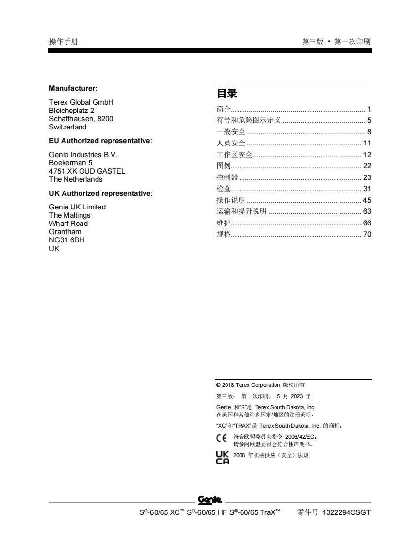GENIE吉尼—60-XC™–65-XC™—-60-HF-S–65-HF—-60-TraX_—65-TraX-序列号范围曲臂吊高空作业平台操作说明书手册348072@abc20天前发布关注私信3.07MB86页046GENIE吉尼—60-XC™–65-XC™—-60-HF-S–65-HF—-60-TraX_—65-TraX-序列号范围曲臂吊高空作业平台操作说明书手册此内容为付费资源,请付费后查看¥39¥49黄金会员免费钻石会员免费立即购买您当前未登录!建议登陆后购买,可保存购买订单付费资源 第1页 / 共86页 第2页 / 共86页 试读已结束,还剩84页,您可下载完整版后进行离线阅读 THE END说明书手册 文本预览 GenieA TEREX BRAND操作手册序列号范围S®.60XCmS®.65XCmS®.60HFS®.65HFS-60 TraXTMS®.65 TraX"M带有维修信息原始说明的翻译Third EditionFirst PrintingPart No.1322294CSGT 查看更多 收起部分 喜欢就支持一下吧收藏