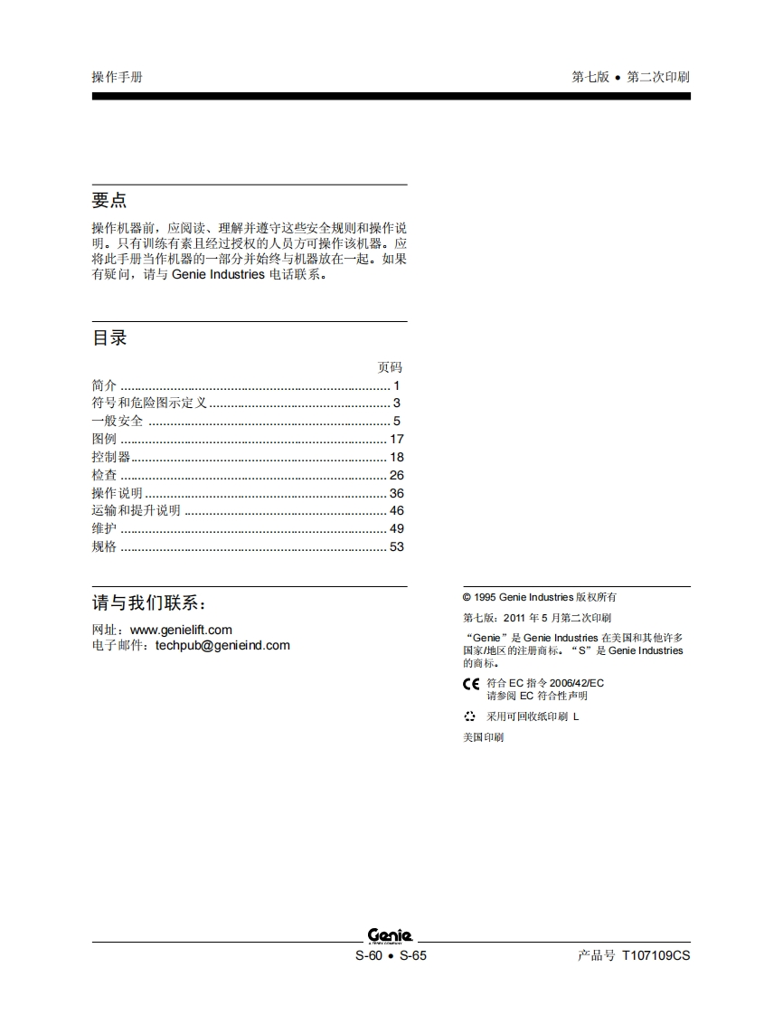GENIE吉尼-序列号范围–60–65-S6010-21000之后曲臂吊高空作业平台操作说明书手册348072@abc19天前发布关注私信1.96MB58页027GENIE吉尼-序列号范围–60–65-S6010-21000之后曲臂吊高空作业平台操作说明书手册此内容为付费资源,请付费后查看¥39¥49黄金会员免费钻石会员免费立即购买您当前未登录!建议登陆后购买,可保存购买订单付费资源 第1页 / 共58页 第2页 / 共58页 试读已结束,还剩56页,您可下载完整版后进行离线阅读 THE END说明书手册 文本预览 GonieA TEREX COMPANY操作手册序列号范围S-60S6010-21000之后CES-65包括维修信息原始说明的翻译Seventh EditionSecond PrintingPart No.T107109CS 查看更多 收起部分 喜欢就支持一下吧收藏