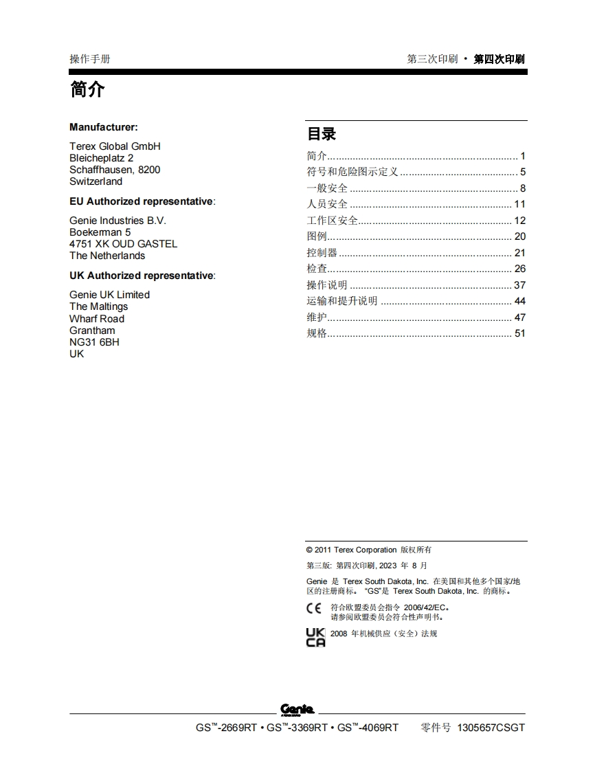 GENIE吉尼-序列号范围-S–2669RT-S_-3369RT-S_-4069RT-GS69F-18000-之后-GS69M-101-之后曲臂吊高空作业平台操作说明书手册348072@abc18天前发布关注私信3.65MB60页023GENIE吉尼-序列号范围-S–2669RT-S_-3369RT-S_-4069RT-GS69F-18000-之后-GS69M-101-之后曲臂吊高空作业平台操作说明书手册此内容为付费资源,请付费后查看¥39¥49黄金会员免费钻石会员免费立即购买您当前未登录!建议登陆后购买,可保存购买订单付费资源 第1页 / 共60页 第2页 / 共60页 试读已结束,还剩58页,您可下载完整版后进行离线阅读 THE END说明书手册 文本预览 GenieA TEREX BRAND操作手册序列号范围GSM-2669RTGS69F-18000之后Gs69M-101之后GSTM-3369RTGSTM4069RT带有维修信息原始说明的翻译Third EditionFourth PrintingPart No.1305657CSGT 查看更多 收起部分 喜欢就支持一下吧收藏