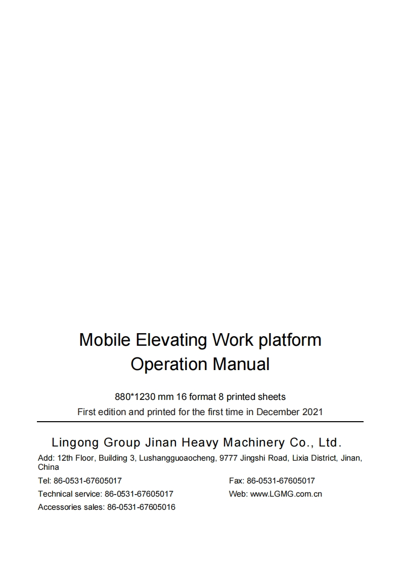 公LGMGOperation ManualSR1018D/SR1218D/SR1323D/SR1623DMobile Elevating work platform△WarningBefore operation and maintenance,thedrivers and service personnel shallalways read and thoroughly understandall information in this manual.Failure todo so may result in,fatal accidents orpersonal injury.This manual must be kept with thismachine at all times.LINGONG GROUP JINAN HEAVY MACHINERY CO.,LTD.