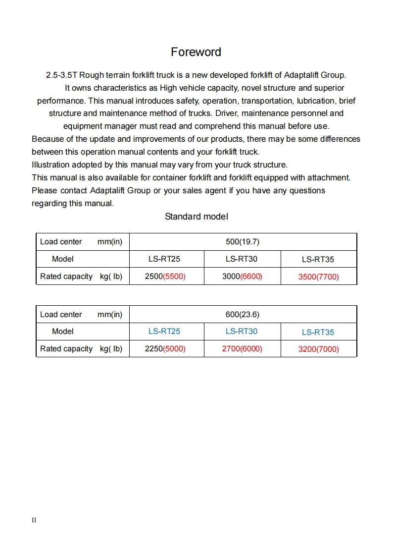Liftsmart-LS-RT25-Operations-Manual操作与维护保养说明书手册348072@abc20天前发布关注私信5.65MB94页028Liftsmart-LS-RT25-Operations-Manual操作与维护保养说明书手册此内容为付费资源,请付费后查看¥29¥39黄金会员免费钻石会员免费立即购买您当前未登录!建议登陆后购买,可保存购买订单付费资源 第1页 / 共94页 第2页 / 共94页 试读已结束,还剩92页,您可下载完整版后进行离线阅读 THE END说明书手册 文本预览 LS-RT25-35&LS-RT25-35-42.5-3.5T Rough Terrain ForkliftOperational and Maintenance Manual(€Original InstructionLS-RT25LS-RT25-4LS-RT30/35LS-RT30/35-4liftsman12/20191 查看更多 收起部分 喜欢就支持一下吧收藏