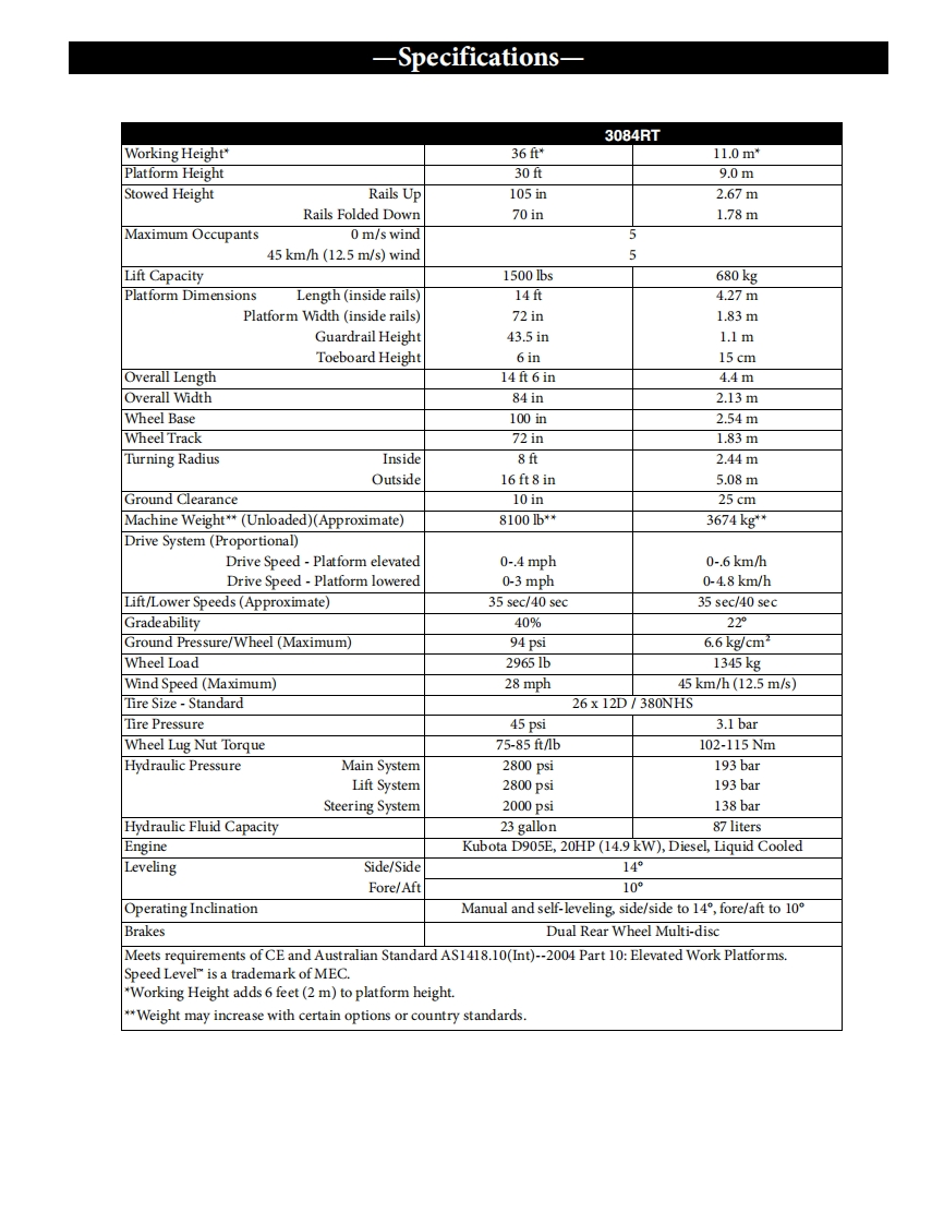 mecOperator's ManualCE/Australian SpecificationsIntroduction.……1Safety.…SafetyAlert Symbols...............................................3Fall Protection.…Electrocution Hazard........................Tip-over Hazards.…6Fall Hazards.…Collision Hazards.…7Additional Safety Hazards.........................................8Battery Safety.…Jobsite Inspection.…Functions Test..…Operating Instructions...........................................10Prestart...Starting Engine from Lower Control Panel..........................2Starting Engine from Upper Control Box...........................12Base Controls Operation and Test................................13Platform Control Operation and Test.................14Joystick Operation.…15Leveling Procedure...............................................17Shutdown Procedure..........................................17Emergency5 ystems....................18Emergency Stop.....…18Emergency Lowering.…18Fold Down Platform Railings ...................................19Machine Inspections.....21Annual Inspection Report.........................................25Maintenance,,,.....:…t…Routine Maintenance............................................27Scheduled Maintenance..........................................2Maintenance Safety...............................................7Lubrication...............................28Component Locations,,,,,,,,,,,,,,,,,,,,,,,,,,,,,,,,2Full Machine.…2Modules............................................303084RTUpper Controls...................31Lower Controls…………32Speed LevelTMDecals…3Troubleshooting.....Serial NumberSerial plate Location.......................................3611800001-upSerial Plate Description.....................36Transport and Lifting Instructions................................37Loading..........................................................37Disengage Brakes before Towing or Winching...............3791942Engage Brakes before Driving......................................37August 2009Lifting and Tie Down Instructions....................9