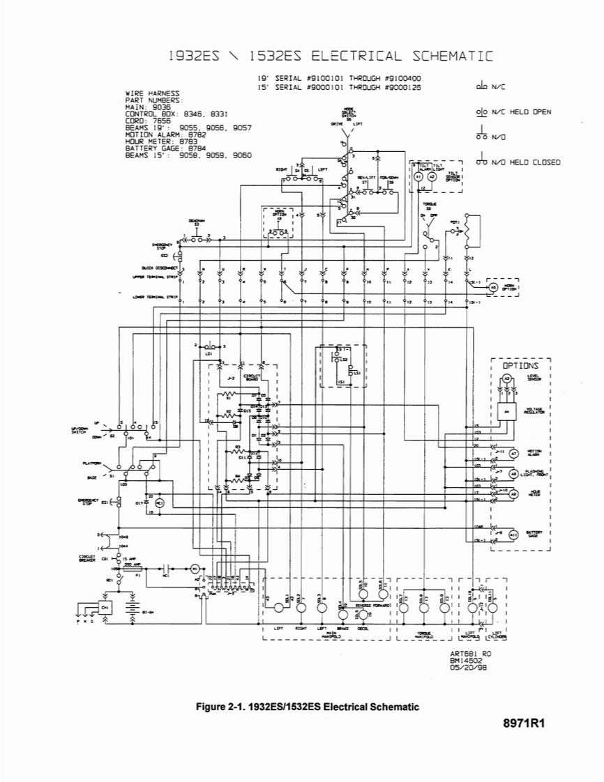 1932ES八1532ESELECTRICAL SSCHEMATIC19'SERIAL #9100101 THROUGH MPRESENT15SERIAL #9000101 THROUGH HPRESENTalo NCWIRE HARNESSPART NUMBERSMA IN:9036C0NTR0LB0X:8346,8331O N/C HELD OPENC0RD:7656BEAM519°:9055.9056.9057aNe是a782OO N/OMETER:8783BATTERY GAGE:87848EAM515':9058,9059,9060O N/D HELO CLOSED"器v《6●OPTIONS51墙281825悲:ART681 ROBM1460210/2597Fig.2-1 1932ES /1532ES Electrical Schematic