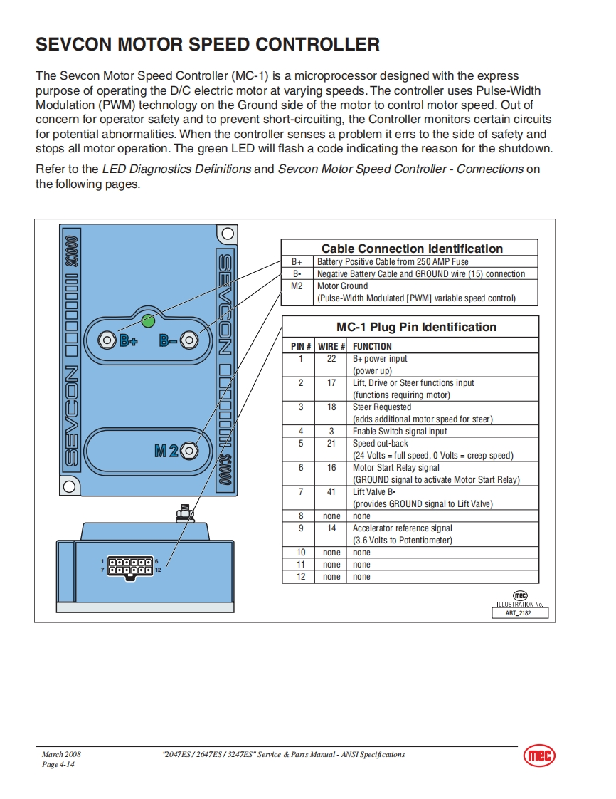 J4可可可o可可18D90J1 Plug Pin Identification7▣▣▣▣▣g▣D100=PIN WIRE#SIGNALFUNCTIONB1110INPUTDrive ReverseINPUTDrive ForwardD150R2D11-0319OUTPUT Brake.Decel Valve signalD3046INPUTSteer LeftD80=D120=OUTPUTSteer signal to SevconD70=D465INPUTDown signalD14=0=D120OUTPUTSignal to Motion Alarm(s)(optional)D5-0=817OUTPUTSevcon Hour MeterD130=(motor function requested)915INPUTBattery NegativeO107INPUTSteer Right11INPUTLift Up(MEC)8601122INPUTLimit Switch(24V platform down)mec)13OUTPUT Enable,from lower Lift switch1421OUTPUTTo Sevcon (for speed cutback)AT_2181⑤21⑤1]FuseContactor3jTilt Sensor41Circuit(Diode)Board51MotorControl Unit6]Main Hamess Connection71Control Cable Connection8]Motion Alarm(option)9]Lift/Lower Switch10]Platform-Base Selector611]Emergency Stop Switch13]Battery GaugeILLUSTRATION No.14]Hour Meter4T_223315]Battery Cutoff Switchmec"2047ES /2647ES /3247ES"Service Parts Manual ANSI SpecificationsMarch 2008Page 4-13