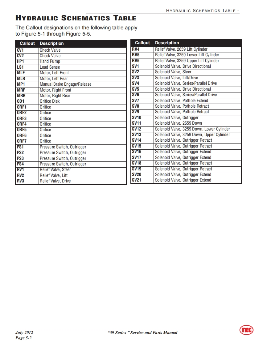 SERVICEmecSection 5SCHEMATICSCONTENTSPAGEHydraulic Schematics Table..............................5-2Hydraulic Schematics--Early Machines5-3Hydraulic Schematics--Later Machines5-6Electrical Schematics--Early Machines5-9Electrical Schematics --Later Machines5-13Controls........···5-16FIGURESPAGEHydraulic Schematic,Early Machines........................5-3Functions Manifold,Early Machine5-4Pothole Outrigger Valve Assemblies,Early Machines ..........5-5Hydraulic Schematic,Later Machines..............5-6Functions Manifold,Later Machine.............5-7Electrical Schematic-Early Machines,1 of 35-9Electrical Schematic-Early Machines,2 of 35-10Electrical Schematic-Early Machines,3 of 35-11Electrical Schematic-Later Machines,1 of 3.................5-13Electrical Schematic-Later Machines,2 of 3..................5-14Electrical Schematic-Later Machines,3 of 3................5-15Lower Controls...............5-16Upper Controls............5-16mec“59 Series”Service and Parts ManualJu2012Page 5-1