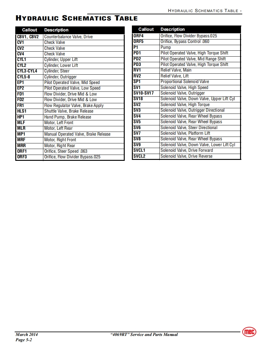 SERVICEmecSection 5SCHEMATICSCONTENTSPAGEHydraulic Schematics Table..............5-2Hydraulic Schematic5-3Electrical Schematics...............5-5FIGURESPAGEHydraulic Schematic5-3Functions Manifold.........................5-4Electrical Schematic,1of3............................··5-5Electrical Schematic,.2of3.................................5-6Electrical Schematic,3 of 35-7mec"4069RT"Service and Parts ManualMarch 2014Page 5-1