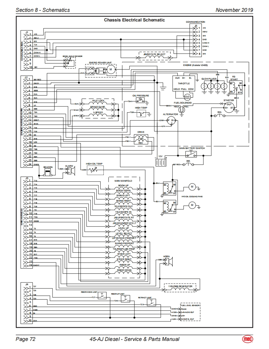 Section 8-SchematicsNovember 2019Lower Control Box1RENT MODULEGP400 MICROPROCESSORElectrical SchematicP1CAN-BUS HIP1-1CA LOC-8J30GBNERATOR P4-1P4EUP&LA灯OT RIGHTP4-4J日O0N&PLATROT LE子TP4-5AnLELOCKSWNG LEFTKCANLOSMING PROPOR TONALUFT UPP5STEER RICHT8e空RLaTALARMTELE EXTENDT日ER白RCTP-12P5-9P6PLATCONTROL VALVEP6-1RSERUPSTARTINHBT UGHTRSERDONP6-5p69HORNP8-2P8-3FUELLEVB S8NS0RP8-7P8-8CURRENT MEASUREP8-9GROUND TOMOOULE P8-14P9Rx P9-1EZCAL DIAGNOSTC8Tx8B+P9-4P7VALVE SUPPLYP7-1KEY SMTCHBASE SBECTP7-2CONTROL BOXBOOM UP SMCHP7-3KEY SMTCHPLAT SBLECTRISER UP SMTOHENGINE STARTP76AS☒RO0 WN SMTCHP7-7RSERUP UMT SMTOHBOOM DOWN SMCH P7-10ELE EEND SMTOH P7-11TELE RETRACT SWITOH P7-12P14JBUPSWITCH P14-1B P14-2RBER DOWNLMIT SMTOH P14-3BOOM RETSWITCHREAR P14-10P15SMING LEFTSWTCH P15-1SMNG RGHT SMCH P15-2PLATLEVELUP SMTCH P15-3GLOWSWTCH P15-4封P15-5PLAT LEVEL DOWN SWITCH P15-6PLAT ROTAERT SMITOH P15-7HIGH SPEED ENABLE SMTO P15-8PLAT ROTATE LEFT SMTOH P15-gBB009TP15-10“T等t图古心Page 7145-AJ Diesel-Service Parts Manual(mec)