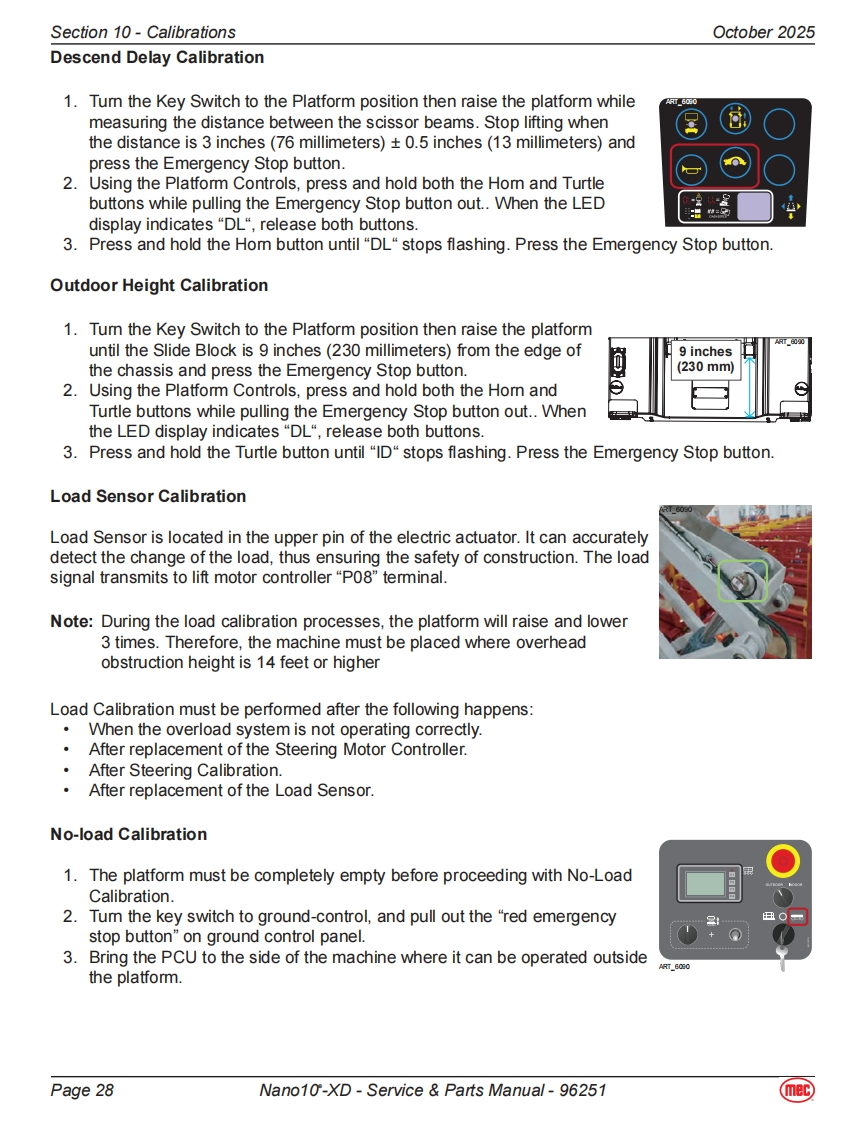 Section 10-CalibrationsOctober 2025CalibrationsCalibration InformationCalibration must be done to ensure proper and safe operation.Each calibration section explains thenature of the calibration and when it should be performed.Tilt Sensor CalibrationThe Tilt Sensor monitors chassis level.The maximum X-axis tilt angle is1.5°and the maximum Y-axis direction is3°.When the machine is raised,the tilt sensor will monitor the angle valueof the chassis in real time.If the tilt angle of the chassis exceeds max tiltangle,the alarm will sound and functions will stop.ART_6090Calibration must be performed when the Level Sensor indication is not accurate or after replacing it.Calibrate Tilt Sensor1.Drive the machine onto level ground.2.Find the reset button on the side of the sensor:"SET ZERO".3.Press and the hold the "SET ZERO"button until the indicatorlight flashes alternatively between red and green.4.Press the "SET ZERO"button 3 times in a row,then theindicator light will stop flashing and the green light stays on.ART_58835.Calibration is complete.Angle Sensor CalibrationThe Angle Sensor is located on the linkage beam,it monitors the heightof the platform by monitoring the angle of the linkage beam in real time.Angle Sensor Calibration must be performed in conjunction with LoadCalibrations or after sensor replacement.Calibrate Angle Sensor1.Refer to the picture to the right and lift the platform halfway.Toensure that the platform is lifted halfway up,lift the platform until thedistance between the beams is 12.5 inches or 317mm.2.Press and the hold the "SET ZERO button until the indicator lightflashes altematively between red and green.3.Press the "SET ZERO"button 3 times in a row,then the indicatorlight will stop flashing and the green light stays on.4.Calibration is complete.Page 27Nano10-XD-Service Parts Manual-96251(mec)