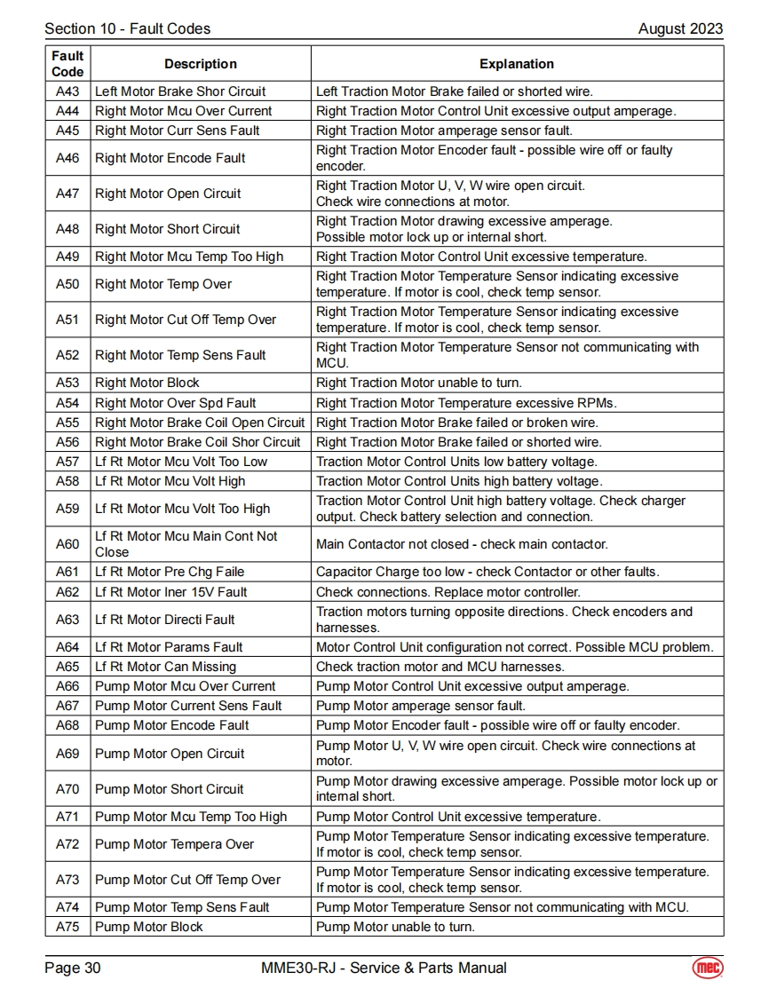 Section 10-Fault CodesAugust 2023Fault Code ListFaultCodeDescriptionExplanationA1PCU 186 TimeoutPlatfom Control Unit (PCU)not communicating.A2PCU 187 TimeoutPlatfom Control Unit(PCU)not communicating.A3ReserveNot used.A4Level Ang TimeoutLevel Sensor failed or open circuit.A5PCU_Y FaultCheck Platform Control Unit(PCU)connections.Replace Platform Control Unit(PCU)board.A6System AlamGeneral fault-see other fault codes.A7Jib Angl FaultJib Position Sensor open or shorted.A8Jib Pres FaultJib Pressure Sensor open or shorted.A9Mast Rot Ev Open LoadMast Rotate Coil open circuit or wire off.A10 Mast Rot Ev Sht LoadMast Rotate Coil shorted-drawing excessive amperage.A11 Mast UD Ev Opn LoadMast Lift Coil open circuit or wire off.A12 Mast UD Ev Sht LoadMast Lift Coil shorted-drawing excessive amperage.A13 Steer Ev Open LoadSteer Coil open circuit or wire off.A14 Steer Ev Short LoadSteer Coil shorted-drawing excessive amperage.A15Pump Can TimeOutPump Motor Controller not communicating.A16Travel Can TimeOutTraction Motor Controller not communicating.A17PCU Can TimeOutPlatfom Control Unit(PCU)not communicating.A18mA_Pres_A_FaultPressure Sensor A output fault.Check pressure sensor and wiring.A19mA_Pres_B_FaultPressure Sensor B output fault.Check pressure sensor and wiring.A20mA_Pres Rdn FaultPressure Sensor A&B output not equal fault.Check pressure sensor and wiring.A21Jib Am Up Ev Opn LoadJib Coil open circuit or wire off.A22 Jib Am Up Ev Sht LoadJib Coil shorted-drawing excessive amperage.A31 Left Motor Mcu Over CurrentLeft Traction Motor Control Unit excessive output amperage.A32Left Motor Curr Sens FaultLeft Traction Motor amperage sensor fault.A33Left Motor Encode FaultLeft Traction Motor Encoder fault-possible wire off or faulty encoder.A34Left Motor Open CircuitLeft Traction Motor U,V.,W wire open circuit.Check wire connections at motor.A35Left Motor Short CircuitLeft Traction Motor drawing excessive amperage.Possible motor lock up or internal short.A36A36:Left Motor Mcu Temp Too HighLeft Traction Motor Control Unit excessive temperature.A37Left Motor Temp OverLeft Traction Motor Temperature Sensor indicating excessivetemperature.If motor is cool,check temp sensor.A38Left Motor Cut Off Temp OverLeft Traction Motor Temperature Sensor indicating excessivetemperature.If motor is cool,check temp sensor.A39Left Motor Temp Sens FaultLeft Traction Motor Temperature Sensor not communicating withMCU.A40Left Motor BlockLeft Traction Motor unable to turn.A41Left Motor Over Spd FaultLeft Traction Motor Temperature excessive RPMs.A42Left Motor Brake Coil Open CircuitLeft Traction Motor Brake failed or broken wire.Page 29MME30-RJ-Service Parts Manual(mec)