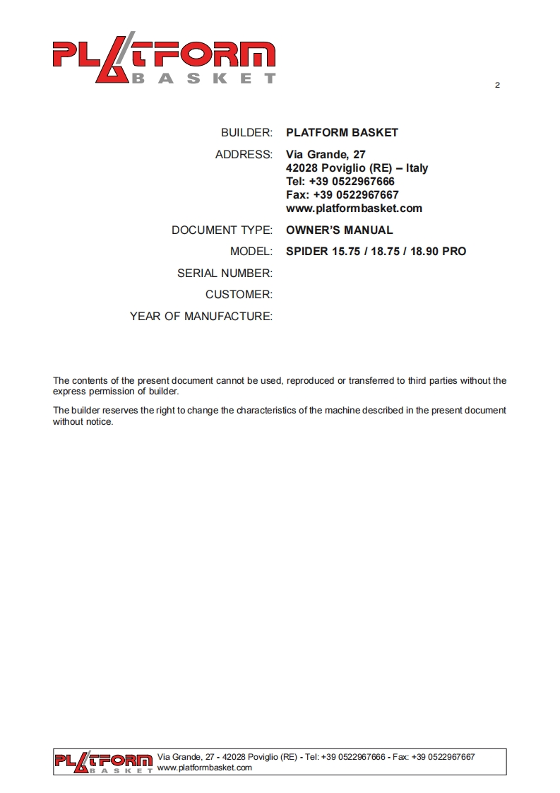PLFORmASEReference use and maintenance manualENSPIDER15.75/18.75/18.90PROAerial work platformAttentionBefore proceeding with any work on the machine read the present handbook in its entiretyand ensure you understand the information contained herein.Keep the handbook in a safe place where it is easily accessible for consultation.Code4808525201ORIGINAL INSTRUCTIONSVersion07/2015Via Grande,202 Poviglio (RE)-Tel:390522967666-Fa:052296767www.platformbasket.com