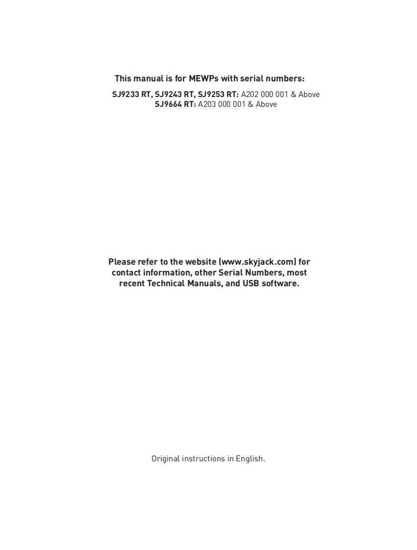Skyjack-SJ9243RT-Operations-Manual操作与维护保养说明书手册348072@abc20天前发布关注私信9.17MB122页041Skyjack-SJ9243RT-Operations-Manual操作与维护保养说明书手册此内容为付费资源,请付费后查看¥29¥39黄金会员免费钻石会员免费立即购买您当前未登录!建议登陆后购买,可保存购买订单付费资源 第1页 / 共122页 第2页 / 共122页 试读已结束,还剩120页,您可下载完整版后进行离线阅读 THE END说明书手册 文本预览 SKYACKOPERATIONMANUALSJ9233 RT,SJ9243 RT,SJ9253 RT,SJ9664 RTROUGH TERRAIN SCISSORS221491AFAJanuary 2021ANSI/CSA 查看更多 收起部分 喜欢就支持一下吧收藏