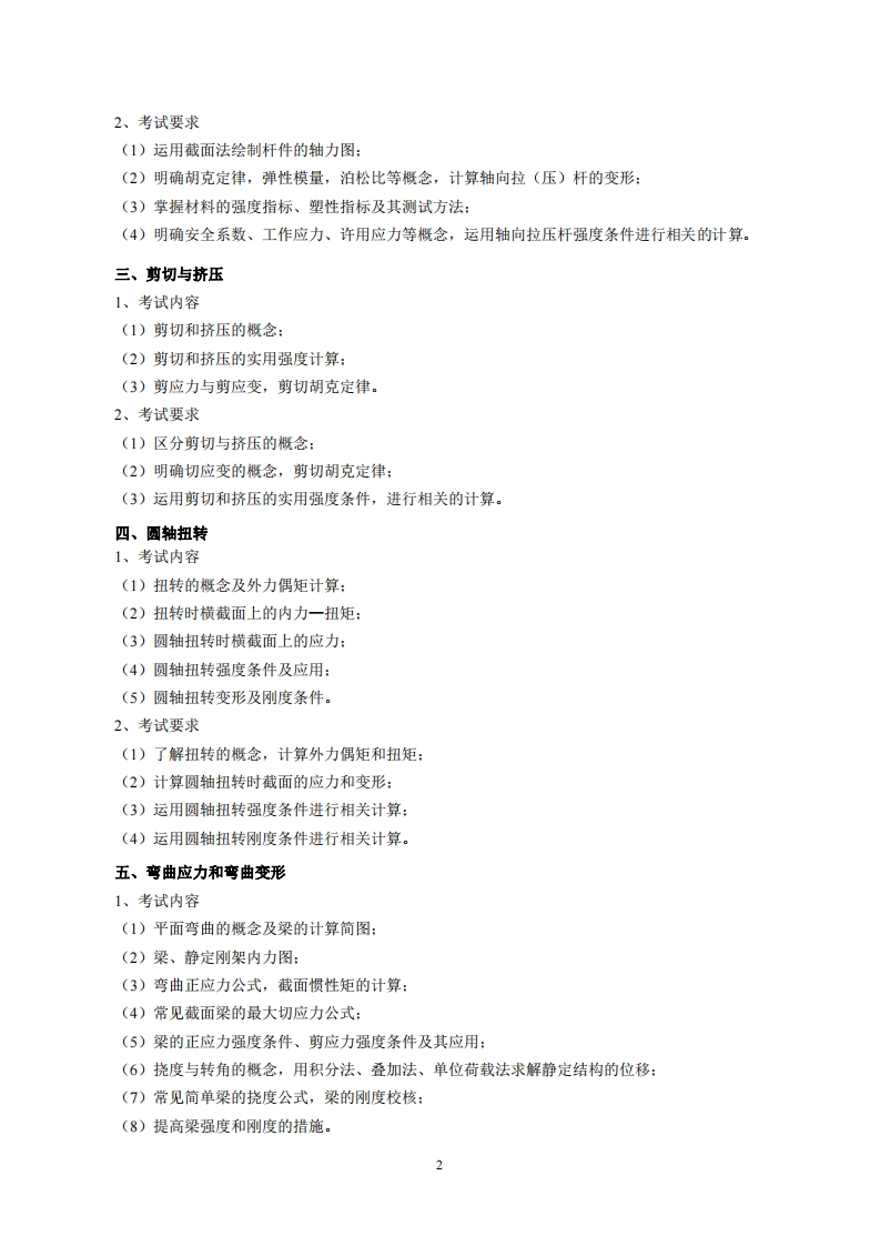 五邑大学2025年三二分段专升本转段考试《材料力学》考试大纲I,适用专业:道路桥梁工程技术专业(高本三二分段三年制)Ⅱ.考试内容与要求总体要求:通过《材料力学》的学习,考查运用杆件强度、刚度和稳定性计算的基本理论和方法,解决工程问题的能力:着重考查其运用基本概念和基本方法分析力学问题的能力:(1)对材料力学的基本概念和分析方法有明确的认识:(2)具有对常见的构件简化为力学简图的初步能力:(3)能够分析杆件在轴向拉(压)、剪切、扭转、弯曲时的内力,并绘制相应的内力图:(4)构件在各种基本变形时,能运用应力和变形的理论计算方法进行计算:(5)能够合理运用强度、刚度和稳定性条件对构件进行计算。一、绪论及基本概念1、考试内容(1)构件强度、刚度和稳定性的概念:(2)本课程的主要任务:(3)可变形固体的概念和基本假设:(4)基本变形杆件的受力和变形特征。2、考试要求(1)明确构件强度、刚度和稳定性,可变形固体的概念,课程的主要任务:(2)明确材料力学的基本假设:(3)根据基本变形杆件的受力和变形特征,判断杆件的基本变形。二、轴向拉伸与压缩1、考试内容(1)内力与截面法,轴力、轴力图:(2)轴向拉(压)杆横截面上的应力分布及其计算公式:(3)线应变,胡克定律,弹性模量,泊松比:(4)轴向拉(压)杆变形的计算公式与应用:(5)低碳钢拉伸时的应力一应变曲线、应力特征值、强度指标及塑性指标:(6)铸铁拉伸破坏与压缩破坏行为的比较:(7)安全系数、工作应力、许用应力、危险应力:(8)强度条件,三类强度问题:(9)轴向拉(压)杆的超静定问题:(10)应力集中的概念,圣维南原理。