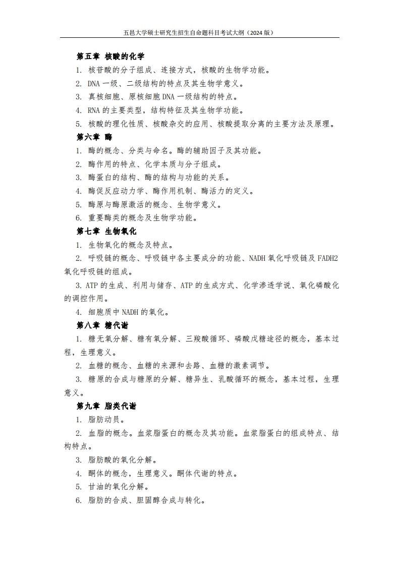 五邑大学硕士研究生招生自命趣科目考试大纲(2024版)硕士研究生招生自命题科目考试大纲科目名称及代码生物化学(338)所在学院(部)生物科技与大健康学院学位授权点生物与医药(086000)一、基本要求《生物化学》是五邑大学生物科技与大健康学院招收生物与医药(086000)专业类别硕士学位硕士研究生自命题考试科目。本科目主要考查考生是否了解生物大分子的化学组成、化学结构和生理功能等基本理论知识,是否掌握物质代谢的基本途径及相互联系,以及应用生物化学和分子生物学的相关原理,分析生产和生活中各类有关生物化学问题的能力,具备有关生物领域的科学研究及应用研究等所需的专业技能。二、内容范围第一章糖的化学1.糖的概念、生理功能。2.自然界重要多糖的化学结构和生理功能。第二章脂类的化学1.脂类的概念、分类及生理功能。2.必需脂肪酸。第三章维生素与微量元素1.维生素的概念、命名与分类。2.维生素的缺乏症与中毒。3.脂溶性维生素的活性形式、生物学功能。4.水溶性维生素的活性形式、生物学功能。第四章蛋白质的化学1.蛋白质的元素组成及元素组成特点、蛋白质的生物学功能。2.氨基酸是蛋白质组成的基本单位。3.蛋白质一级结构、二级结构、三级结构、四级结构。蛋白质结构与功能的关系。4.蛋白质重要的理化性质。