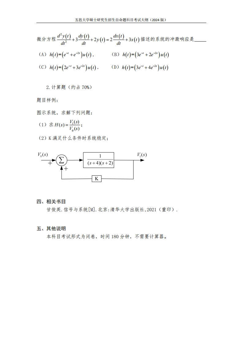 五邑大学硕士研究生招生自命趣科目考试大纲(2024版)硕士研究生招生自命题科目考试大纲科目名称及代码信号与系统(801)所在学院(部)智能制造学部学位授权点信息与通信工程(081000)一、基本要求信号与系统是五邑大学智能制造学部招收信息与通信工程(081000)一级学科硕士研究生自命题考试科目。本科目主要考查考生是否理解并应用信号与系统的基本理论和基本分析方法,包括信号与系统的基本概念、信号的表示、卷积、傅里叶变换、拉普拉斯变换、信号流图、状态变量方法等,并会应用这些基本理论和方法对信号进行频谱分析,对系统进行时域分析、频域分析、S域分析、稳定性分析等。二、内容范围1.信号的概念、信号的描述与分类、基本信号、阶跃信号与冲激信号、信号的运算、信号的波形变换、系统的概念、系统的描述与分类、线性时不变系统。2.系统微分方程的求解、系统的零输入响应、零状态响应、阶跃响应和冲激响应,卷积及其性质;线性系统响应的时域求解。3.周期信号的傅里叶级数展开,信号的傅里叶变换:常用信号的频谱分析,傅里叶变换的性质,信号通过系统的频域分析方法,系统的频率响应,理想滤波器,信号通过线性系统不失真的条件,连续时间信号的抽样及重建。4.拉普拉斯变换,常用函数的拉普拉斯变换,拉普拉斯变换的性质,拉普拉斯反变换,系统函数,用拉普拉斯变换法分析系统,系统函数极点和零点的分布与系统时域特性频率特性的关系,系统的稳定性分析,系统模拟,信号流图。5.系统的状态变量分析,连续时间LTI系统状态方程的建立,连续时间LTI系统状态方程的求解。三、题型结构试卷满分共150分,主要题型结构如下:1.选择题(约占30%)题目样例: