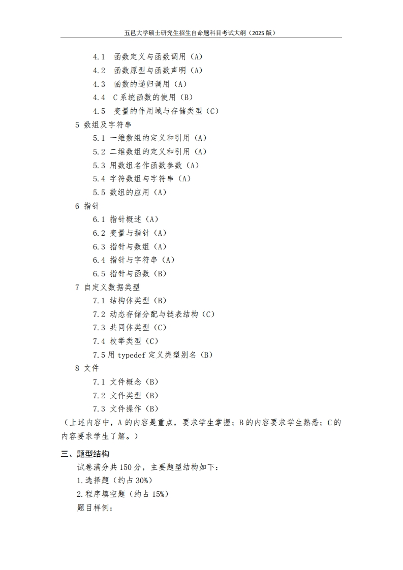五邑大学硕士研究生招生自命趣科目考试大纲(2025版)硕士研究生招生自命题科目考试大纲科目名称及代码C语言程序设计(⑧09)所在学院电子与信息工程学院学位授权点电子信息(085400)一、基本要求C语言程序设计是五邑大学电子与信息工程学院招收电子信息(085400)、模式识别与智能系统(081104)硕士学位研究生自命题考试科目。本科目主要考查考生是否了解程序设计基础理论,能应用基本语法结构和编程逻辑原理分析问题的需求,判断程序可行性与正确性,设计相关程序。二、内容范围1概述1.1程序、软件及软件开发方法(C)1.2C语言的发展(C)1.3C程序的基本构成及开发过程(A)2C语言基础2.1C的标识符与关键字(A)2.2C的基本数据类型(A)2.3C的运算符与表达式(A)2.4不同类型数据间的转换(A)2.5C的基本输入/输出操作(A)2.6编译预处理(B)3算法描述及控制结构3.1算法概念及算法的描述方法(B)3.2C语句概述(B)3.3选择结构与if语句和switch语句(A)3.4多重选择结构(选择结构的嵌套)(A)3.5循环结构与三种循环语句(A)3.6多重循环结构(循环结构的嵌套)(A)3.7转向语句(B)4函数