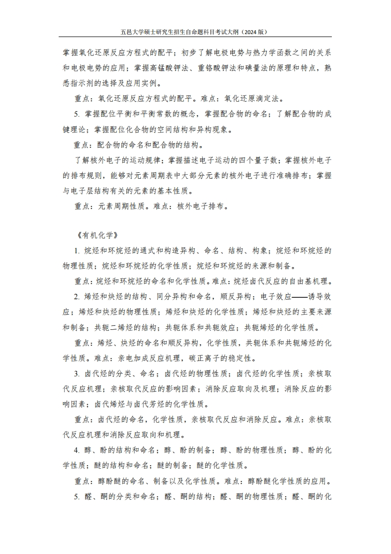五邑大学硕士研究生招生自命趣科目考试大纲(2024版)硕士研究生招生自命题科目考试大纲科目名称及代码综合化学(816)所在学院(部)生物科技与大健康学院学位授权点化学工程与技术(081700)和材料与化工(085600)一、基本要求《综合化学》是五邑大学生物科技与大健康学院招收化学工程与技术(081700)一级学科和材料与化工(085600)专业类别硕士学位研究生自命题考试科目。本科目主要考查考生是否了解化学方面掌握基础理论、基本知识和基本技能,能应用无机化学、分析化学和有机化学的相关原理,运用所学化学知识,分析生活、生产和社会中的各类有关化学问题的能力,能设计无机及分析和有机化学实验方案。二、内容范围《无机及分析化学》1.理解体系,状态函数,环境等热力学和动力学基本概念:掌握化学反应过程热效应的计算;熟练计算平衡数据;了解化学反应速率及其理论。重点:化学平衡。2.理解掌握酸碱质子理论中酸碱的定义、共轭酸碱对、弱酸和弱碱的电离平衡和分布系数:掌握质子条件式的写法:掌握一元弱酸和一元弱碱溶液酸度计算和缓冲溶液pH计算;掌握指示剂的变色范围和选择原则;熟悉准确滴定和分步滴定的条件;掌握酸碱滴定分析结果的计算。重点:溶液pH值的计算。难点:酸碱滴定的应用。3.熟悉沉淀平衡理论,掌握重量分析法对沉淀的要求,掌握溶度积的概念及计算;掌握影响沉淀溶解度的因素;了解沉淀的形成机理,熟悉影响沉淀纯度的因素。重点:沉淀-溶解平衡的移动。4掌握电极电势、标准电势和条件电势的含义,熟悉电极电势的影响因素: