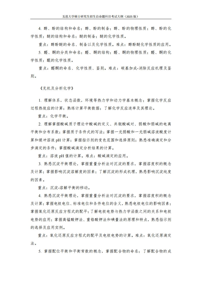 五邑大学硕士研究生招生自命趣科目考试大纲(2025版)硕士研究生招生自命题科目考试大纲科目名称及代码综合化学(816)所在学院(部)环境与化学工程学院学位授权点化学工程与技术(081700)和材料与化工(085600)一、基本要求综合化学(816)是五邑大学环境与化学工程学院招收化学工程与技术(081700)一级学科和材料与化工(085600)专业类别硕士学位研究生自命题考试科目。本科目主要考查考生对化学方面基础理论、基本知识和基本技能的掌握情况,能应用无机化学、分析化学和有机化学的相关原理及化学知识,分析生活、生产和社会中的各类有关化学问题,能够设计有机、无机及分析实验方案。二、内容范围《有机化学》1.烷烃和环烷烃的通式和构造异构、命名、结构、构象;烷烃和环烷烃的物理性质;烷烃和环烷烃的化学性质;烷烃和环烷烃的来源和制备。重点:烷烃和环烷烃的命名和化学性质。难点:烷烃卤代反应的自由基机理。2.烯烃和炔烃的结构、同分异构和命名,顺反异构:电子效应一诱导效应:烯烃和炔烃的物理性质:烯烃和炔烃的化学性质:烯烃和炔烃的主要来源和制备;共轭二烯烃的结构;共轭体系和共轭效应;共轭烯烃的化学性质。重点:烯烃、炔烃的命名和顺反异构,化学性质,共轭体系和共轭烯烃的化学性质。难点:亲电加成反应机理,碳正离子的稳定性。3.卤代烃的分类、命名;卤代烃的物理性质;卤代烃的化学性质;亲核取代反应机理:亲核取代反应的影响因素:消除反应取向及机理;消除反应的影响因素:卤代烯烃与卤代芳烃的化学性质。重点:卤代烃的命名,化学性质,亲核取代反应和消除反应。难点:亲核取代反应机理和消除反应取向和机理。。
