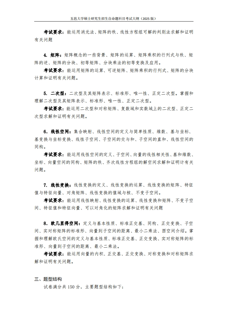 五邑大学硕士研究生招生自命趣科目考试大纲(2025版)硕士研究生招生自命题科目考试大纲科目名称及代码高等代数(818)所在学院(部)数学与计算科学学院学位授权点数学(0701)一、基本要求《高等代数》是五邑大学数学与计算科学学院招收数学一级学科学术型类别硕士学位硕士研究生自命题考试科目。《高等代数》是数学专业的一门重要基础课程。要求考生比较系统地理解高等代数的基本概念和基本理论,掌握高等代数的基本思想和方法。要求考生具有抽象思维能力、逻辑推理能力、运算能力和综合运用所学的知识分析问题和解决问题的能力。通过考核本科目,为培养学生良好的数学素养,打下较扎实的代数学理论基础,提高学生的抽象思维的能力和逻辑推理能力,并掌握较系统的代数基础知识,为学习后续研究生课程服务。二、内容范围本科目考核的内容范围有如下8个方面:1.多项式:数域、一元多项式的定义和运算、多项式的整除性、多项式的最大公因式、多项式的分解、重因式、多项式函数和多项式的根、复系数和实系数多项式的因式分解、有理系数多项式。考试要求:能运用多项式的概念与基本性质、多项式的整除性、最大公因式和分解、有理系数多项式等理论知识求解和证明有关问题。2.行列式:线性方程组和行列式、排列、n阶行列式、阶行列式的性质、行列式的计算、余子式和代数余子式、行列式的展开、克拉默法则。考试要求:能运用行列式性质、展开定理和克拉默法则计算和证明有关问题。3.线性方程组:消元法、向量空间、线性相关性、矩阵的秩、线性方程组可解的判别法、线性方程组解的结构。