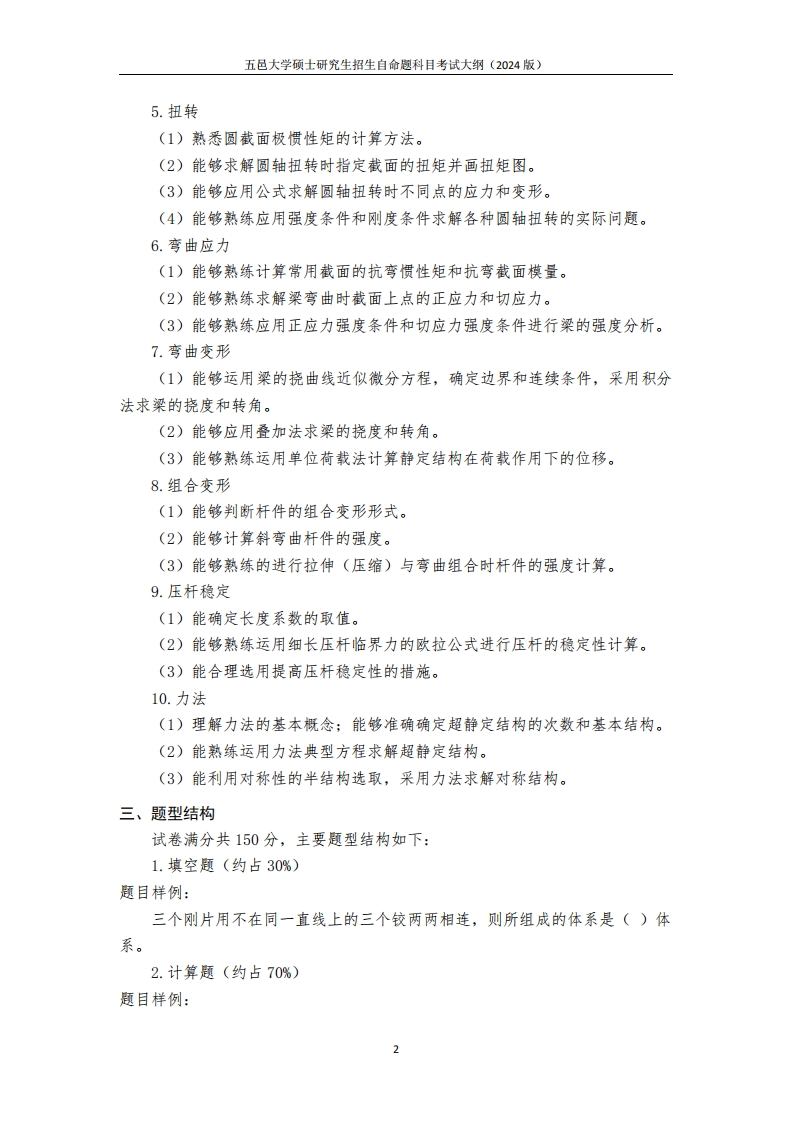 五邑大学硕士研究生招生自命趣科目考试大纲(2024版)硕士研究生招生自命题科目考试大纲科目名称及代码工程力学(831)所在学院(部)土木建筑学院学位授权点土木水利(085900)一、基本要求工程力学是五邑大学土木建筑学院招收土木水利(085900)专业类别硕士学位研究生自命题考试科目。本科目主要考查考生能否对平面结构的几何组成规律进行分析,计算平面静定结构和超静定结构的约束力、内力和位移,分析构件在各种条件下的强度、刚度和稳定性等问题。二、内容范围1.受力分析、平面力系的平衡方程及其应用(1)能结合工程中常见约束的特征和约束反力的画法,熟练绘制结构的受力图。(2)理解相关概念和公理:能将力向坐标轴投影、取矩;能够熟练进行力偶的相关计算。(3)运用各种力系的平衡条件,进行平面任意力系的计算。2.平面杆件体系的几何组成分析(1)总结几何不变体系、几何可变体系、几何瞬变体系、自由度(静力自由度)约束及其类型等基本概念。(2)熟练应用几何不变体系的组成规则(两刚片法则、三刚片法则、二元体法则)计算平面杆件体系的计算自由度。3.静定结构的内力计算(1)能够熟练应用截面法对梁、桁架以及刚架等静定结构的内力进行计算。(2)能够熟练绘制梁、桁架以及刚架等静定结构的内力图。(3)总结各种结构形式的受力特点。4.轴向拉伸和压缩(1)总结材料在拉伸和压缩时的力学性能以及胡克定律。(2)能够熟练计算拉伸和压缩的应力、应变和位移。(3)能够熟练应用强度条件求解各种强度问题。1