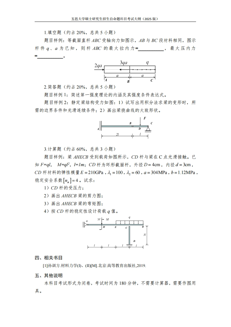 五邑大学硕士研究生招生自命趣科目考试大纲(2025版)硕士研究生招生自命题科目考试大纲科目名称及代码材料力学(832)所在学院(部)轨道交通学院学位授权点交通运输(0861)一、基本要求材料力学是五邑大学轨道交通学院招收交通运输专业类别硕士学位硕士研究生自命题考试科目。本科目主要考查考生在了解拉压、剪切、扭转和弯曲四大基本变形的特点、基本概念及适用范围,掌握杆件在静载荷作用下的相关计算原理与方法,熟悉组合变形的分析方法和计算原理的基础上,能够应用工程常用的四个经典强度理论,判断和分析复杂工程问题等,并且在满足强度、刚度和稳定性要求下、设计出既安全又经济的构件。二、内容范围1.了解材料力学的任务和研究对象。2熟练掌握拉压、剪切、扭转和弯曲四大基本变形的基本概念、计算原理和方法。3.理解组合变形概念,熟练掌握组合变形相关复杂问题的分析方法,能够计算有关构件的强度、刚度和稳定性等问题。4理解平面弯曲的概念,熟练掌握梁弯曲时,剪力图和弯矩图的画法。5.理解截面几何性质的概念,了解形心位置的求法,熟练掌握组合图形惯性矩的计算方法。6.了解挠度、转角和挠曲线的近似微分方程,能用积分法和叠加法求挠度和转角,并能求解筒单超静定梁。7理解应力状态的概念,熟练掌握平面应力状态下任意斜截面上的应力的计算;熟悉利用解析法和应力圆,求解主平面方位、主应力大小、最大切应力。8理解强度理论的概念,熟练掌握四个强度理论适用范围及其应用条件。9.理解压杆稳定性的概念,熟悉各种约束条件下轴心受压直杆的临界力计算公式,理解临界应力及欧拉公式的适用范围、经验公式、压杆稳定的计算。三、题型结构试卷满分共150分,主要题型结构如下: