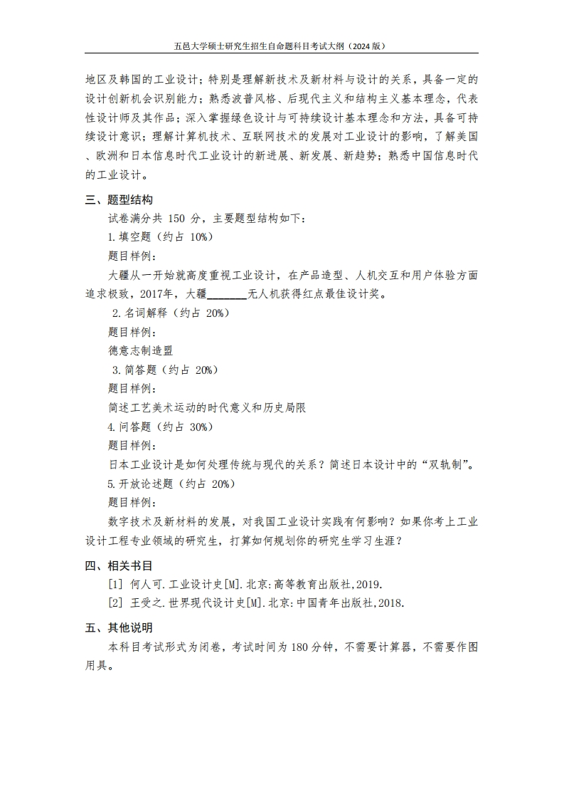 五邑大学硕士研究生招生自命趣科目考试大纲(2025版)硕士研究生招生自命题科目考试大纲科目名称及代码设计史论(839)所在学院艺术与设计学院学位授权点工业设计工程(085507)一、基本要求设计史论是五邑大学艺术与设计学院招收机械专业类别工业设计工程(085507)专业领域硕士学位研究生自命题考试科目。本科目主要考查考生是否了解设计历史发展脉络理论,能否真正理解设计风格嬗变的社会文化背景,熟悉新技术、新工艺、新材料的进步与应用对设计创新内容和形式的影响,帮助学生树立端正、严谨的专业思想,增强可持续发展和社会责任意识,提高设计的自觉性,确立正确的设计观。二、内容范围1.设计萌芽阶段的特征,理解萌芽状态设计概念的内涵和外延;理解新时期时代,由于人类掌握了通过化学变化改变材料特性的方法,进入手工艺设计阶段的历史背景,特别是熟悉并理解中外重要传统手工艺品的设计理念、时代背景、发展脉络、典型工艺、功能特征的差异。2.理解劳动分工与设计的关系,熟悉18世纪的欧洲的主流设计风格和设计特征,熟悉魏德伍德在陶瓷工业乃至工业设计发展上的地位:理解这一时期美国制造体系的主要理念和核心思想,以及其对设计的影响;理解工艺美学运动兴起的原因,时代背景,特别是熟悉拉斯金、莫里斯等人的主要观点,莫里斯的设计实践和代表作品,工艺美术运动的时代意义和历史局限。熟悉芝加哥学派、新艺术运动、德意志制造联盟的基本主张、代表性设计作品以及对设计历史发展的意义。3.理解20世纪前20年新材料与现代设计,技术与设计的关系;熟悉风格派、构成派、俄罗斯先锋艺术、柯布西埃与机器美学的设计理念,代表性设计师及其作品;深入理解格罗披鸟斯与包豪斯时代背景,主要教育理念和举措,在现代主义设计发展中的历史地位;熟悉20世纪20-30年代欧美艺术装饰风格、流线型风格、斯堪的纳维亚风格。了解美国工业设计职业化的意义,欧美职业工业设计师主要观点和理念的差异。4.了解意大利的设计风格与个性,熟悉日本的传统文化与高技术,中国台湾