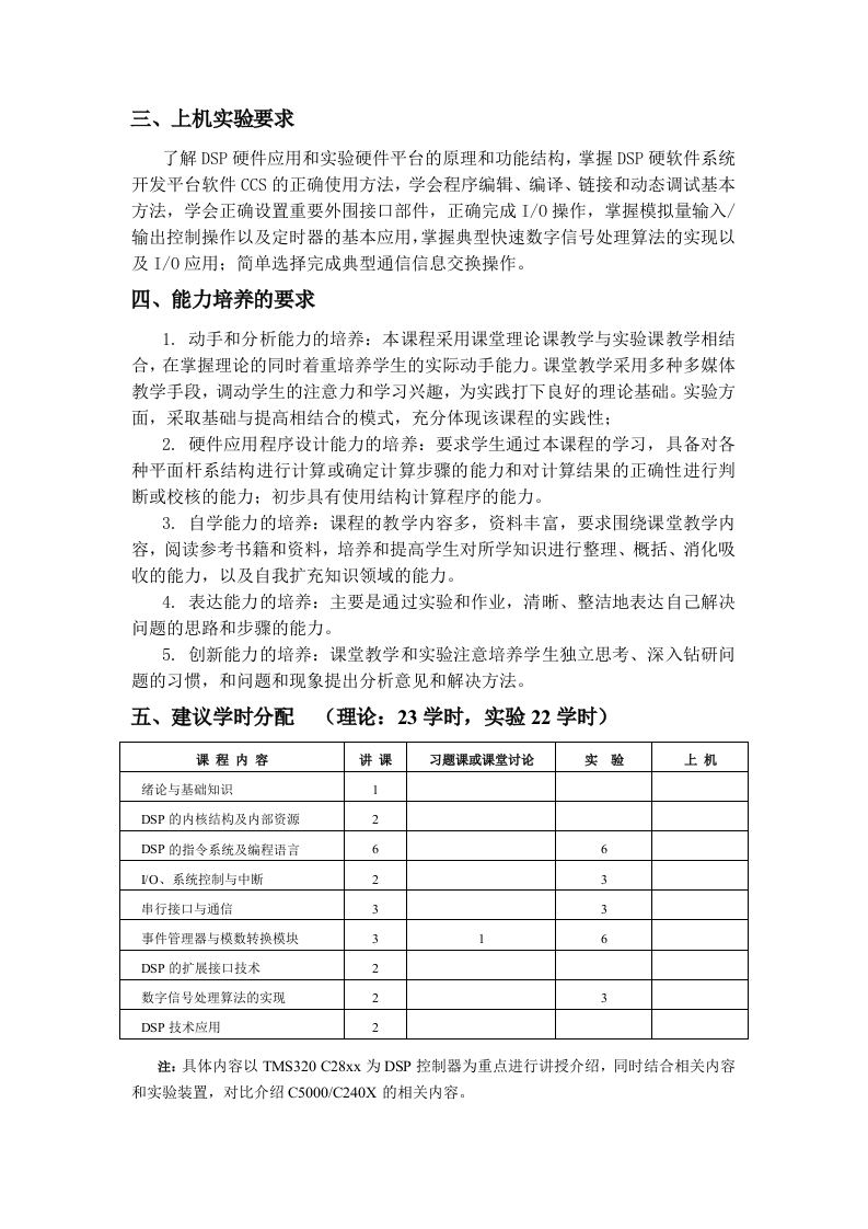 DSP技术及课程设计(总学分:2总上课时数:23上机实验时数:22)一、课程的性质与目的本课程是电类专业本科生的一门以实践为主的技术类专业选修课,课程的教学目的,是使学生了解DSP及DSP控制器的发展过程及其特点,使学生较熟练地在硬件上掌握DSP及DSP硬件器的结构、各部件基本工作原理,在软件上掌握DSP的指令系统、程序设计方法,学会TMS320系列中1至2种DSP芯片的基本使用方法,并能重点利用DSP及DSP控制器设计典型的应用系统,为今后从事相关设计与研究打下基础。二、课程内容的教学要求1.绪论与基础知识:了解DSP的基本概念、产生背景及其发展状况,了解数字信号处理的特点和DSP的主要应用方向,了解TI公司TMS320C5000/2000系列DSP的基本结构,简单了解DSP高级技术发展。2.TMS320系列DSP的内核结构及资源:熟悉TMS320系列DSP的常用引脚及其功能,理解DSP的总线结构及其特点,掌握DSP的CPU结构及其组成,理解DSP的指令周期和总线周期,掌握TMS320系列DSP的中断系统:了解DSP的程序存储器、数据存储器、I/0空间以及片内外设资源:3.DSP的指令系统及编程语言:掌握TMS320C2000系列DSP的单片机的寻址方式及指令系统,熟悉编程调试环境CCS,初步学会编制简单的汇编语言程序:熟悉DSP的C语言开发环境,掌握DSP的C语言设计。4.DSP的I/0、系统控制与中断:掌握DSP的时钟电路,复位电路的设计,掌握DSPI/O空间接口使用方法,掌握DSP的中断、中断源、中断优先权、中断控制方法,以及中断程序设计方法,理解DSP片内定时器组成结构和功能原理及应用程序设计方法,5.DSP的典型串行接口和通信:理解两种DSP串行通讯口的结构、功能、工作方式、掌握串行通讯的应用程序设计方法:理解CAN总线通信和MeBSP基本原理和接口应用:6.DSP事件管理器与模数转换模块:理解事件管理器的基本功能,重点理解掌握定时器、PWM和捕获单元的基本原理和使用方法:7.DSP扩展接口技术:掌握DSP片外扩展程序/数据存储器以及外部I/0接口的设计方法,了解DSP模拟量接口扩展方法。8.数字信号处理算法的实现:F℉T和典型滤波器算法的实现:9.DSP技术应用:分别结合几个图象处理应用实例图象处理和DSP控制系统典型应用实例,介绍DSP应用技术,掌握典型DSP系统的分析与设计原则与方法,了解DSP的高级应用。