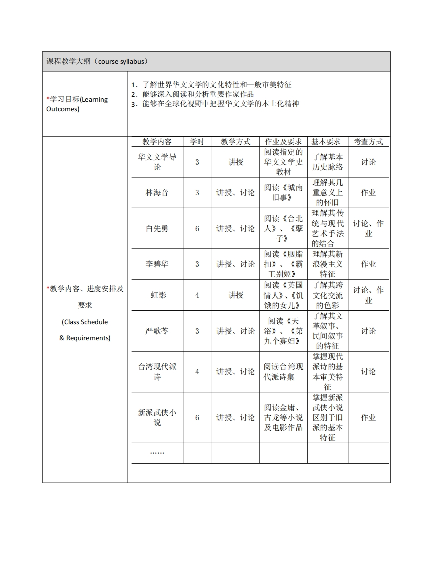 《世界华文文学》课程教学大纲课程基本信息(Course Information)课程代码*学时*学分CL324(Credit322(Course Code)(Credits)Hours)*课程名称(中文)世界华文文学专题(Course Name)(英文)World Chinese Literature课程性质中文系专业选修课(双代码)(Course Type)授课对象(Audience)中文系本科生(面向全校开放)授课语言(Language of Instruction)汉语*开课院系人文学院中文系(School)先修课程(Prerequisite)无授课教师汪云霞课程网址(Instructor)(Course Webpage)本课程属双代码课程,它既是汉语言文学(中外文化交流方向)本科生的专业基础课,又作为通识核心课程供全校学生选修。本课程研究重心主要是中国大陆以外的华文文学作家作品,即港、澳、台和海外的华文文学经典,其中包括华语小说经典,如白先勇、李碧华、虹影、严歌苓、金庸、古龙等人的作*课程简介(Description)品:华语诗歌经典,如纪弦、余光中、郑愁予、洛夫等人的作品:以及华语散文经典,如张晓风、柏杨、龙应台等人的作品。本课程旨在以“世界文学”的观念和“全球化”的文化视野引导学生阅读世界华文文学经典,使学生在提高文学鉴赏力和审美情趣的同时,对“世界华文文学”的“故土性”和“本土化”有一定的了解,从而增强民族文化认同感和中华民族精神家园意识。As one of the double codes course,it is not only one of the compulsory coursesfor the undergraduates majoring in the Sino-foreign cultural exchanges in thedepartment of Chinese language and literature,but also a key general educationalcourse for the students from all the university.This course focuses on the writersout of the mainland China (Hong Kong,Macau,Taiwan,and oversea'Chineseregions,etc.)and their writings in Chinese.The Chinese classical novels written by*课程简介(Description)Bai Xianyong,Li Bihua,Hong Ying,Yan Gelin,Jin Yong,Gu Long,etc,the Chineseclassical poetries by Ji Xian,Yu Guangzhong,Zhong Chouyu,Luo Fu,etc,and theChinese classical prose by Zhang Xiaofeng,Bo Yang,Long Yingtai,etc,are allincluded.In a perspective of world literature and globalization,this course aims toguide the students to read some of the World Chinese literature classics,to helpthem to promote their appreciations of literature and esthetic sentiment,tounderstand the nationality and localization of world literature,and to enhance theidentification of Chinese national culture and Chinese spiritual home.
