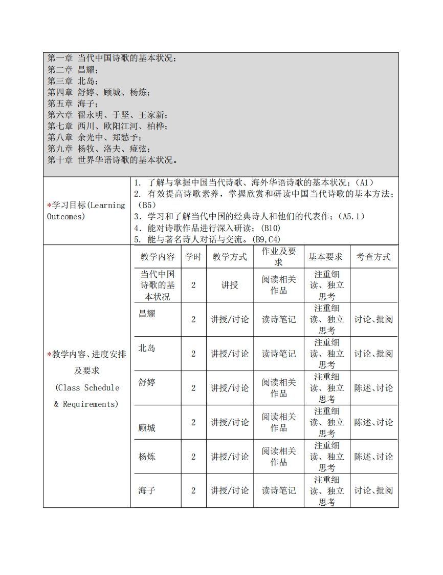 《当代诗歌导读》课程教学大纲课程基本信息(Course Information)课程代码*学时(Credit32学分2(Course Code)(Credits)Hours)*课程名称当代诗歌导读(Course Name)The History of Contemporary Poetry课程性质专业选修课(Course Type)授课对象(Audience)本科生授课语言(Language of中文Instruction)*开课院系(School)人文学院先修课程(Prerequisite)无授课教师何言宏课程网址(Instructor)(Course Webpage)《当代诗歌导读》课程是面向中文本科生以及其他诗歌爱好者开设的一门专业选修课,其任务,是要在世界性的文学视野中,向学生系统、重点讲授“二战”结束以来经典性的中国诗人和他们的代表作*课程简介品,以培养他们欣赏、解读诗歌的能力和水平,范围包括中国大陆、(Description)香港、台湾和海外华语诗人,如昌耀、北岛、舒婷、顾城、杨炼、海子、翟永明、于坚、王家新、西川、欧阳江河、余光中、杨牧、洛夫、郑愁予和痖弦等。*课程简介(Description)课程教学大纲(course syllabus)