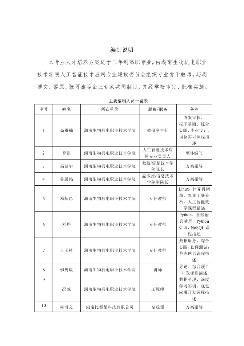 三年制高职人工智能技术应用专业方案人才培茅养三年制高职人工智能技术应用专业人才培养方案348072@abc昨天发布关注私信41.83MB86页028三年制高职人工智能技术应用专业方案人才培茅养三年制高职人工智能技术应用专业人才培养方案此内容为付费资源,请付费后查看¥23¥33黄金会员免费钻石会员免费立即购买您当前未登录!建议登陆后购买,可保存购买订单付费资源 第1页 / 共86页 第2页 / 共86页 试读已结束,还剩84页,您可下载完整版后进行离线阅读 THE END人工智能农学类办公模板医学类医疗医药单片机设计历史学类哲学类土木工程学习资源工学类教育学类文学类法学类理学类管理学类经济学类艺术学类 文本预览 湖南生地機電虢紫技样学院Hunan Biological And Electromechanical Polytechnic三年制高职人工智能技术应用专业人才培养方案专业名称:人工智能技术应用专业代码:510209适用年级:2025级专业负责人:曾滔所属学院:信息技术学院所属专业群:人工智能技术应用专业群制订时间:2025年5月 查看更多 收起部分 喜欢就支持一下吧收藏