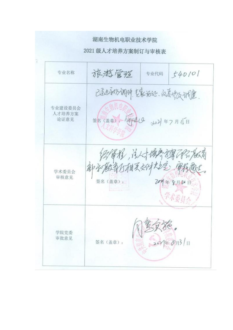 三年制高职旅游管理专业方案人才培郭养三年制高职旅游管理专业人才培养方案348072@abc昨天发布关注私信0.68MB49页021三年制高职旅游管理专业方案人才培郭养三年制高职旅游管理专业人才培养方案此内容为付费资源,请付费后查看¥23¥33黄金会员免费钻石会员免费立即购买您当前未登录!建议登陆后购买,可保存购买订单付费资源 第1页 / 共49页 第2页 / 共49页 试读已结束,还剩47页,您可下载完整版后进行离线阅读 THE END人工智能农学类办公模板医学类医疗医药单片机设计历史学类哲学类土木工程学习资源工学类教育学类文学类法学类理学类管理学类经济学类艺术学类 文本预览 @湖南生啦機宝虢紫技称学院Hunan Biological And Electromechanical Polytechnic三年制高职旅游管理专业人才培养方案专业名称:旅游管理专业代码:540101适用年级:2021级制订时间:2021年4月 查看更多 收起部分 喜欢就支持一下吧收藏