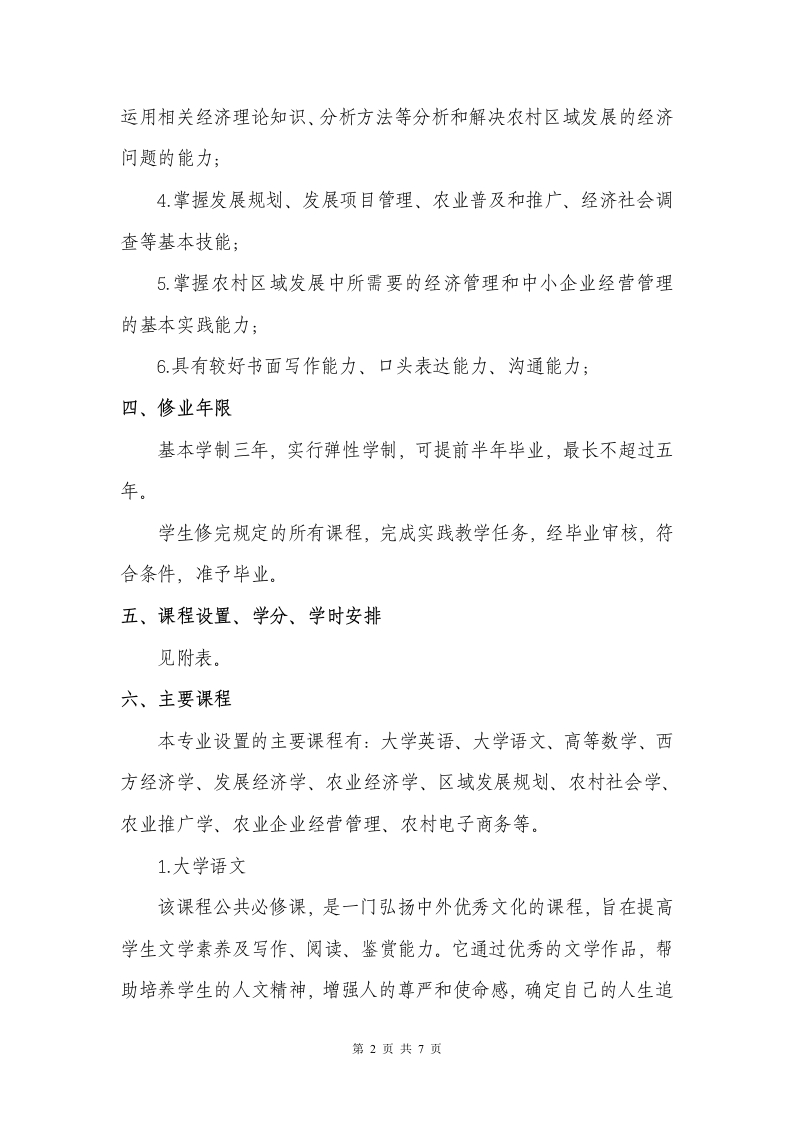 丽水学院农村区域发展专业(专升本函授)人才培养方案一、专业名称、层次专业名称:农村区域发展层次:专升本二、培养目标本专业培养具有农村区域发展方面的基本理论、基本知识和基本技能,能在基层政府及事业单位、各类涉农企业、农业推广管理部门从事计划、规划与设计、推广与发展、经营与管理、教学与科研等工作的应用型、复合型专门人才。三、基本要求本专业学生在系统地学习农村区域发展专业的基础理论和专业知识,接受农村区域发展专业的发展规划、项目管理、推广沟通、调查研究、经济分析和经营管理等方面的专业技能训练后,具备优良的素质结构、能力结构和知识结构。毕业生应获得以下几个方面的知识和能力:1.掌握农村区域发展专业的经济学、管理学等与发展问题相关的基础理论和方法;2熟悉国内与国际农村区域发展,特别是浙江省内各地区的农村区域发展现状、趋势以及区域改革发展的新要求,并且熟悉农村区域发展的制度、政策和法规:3熟悉农村区域发展的理论前沿、新动向、新成就;具备较好地第1页共7页