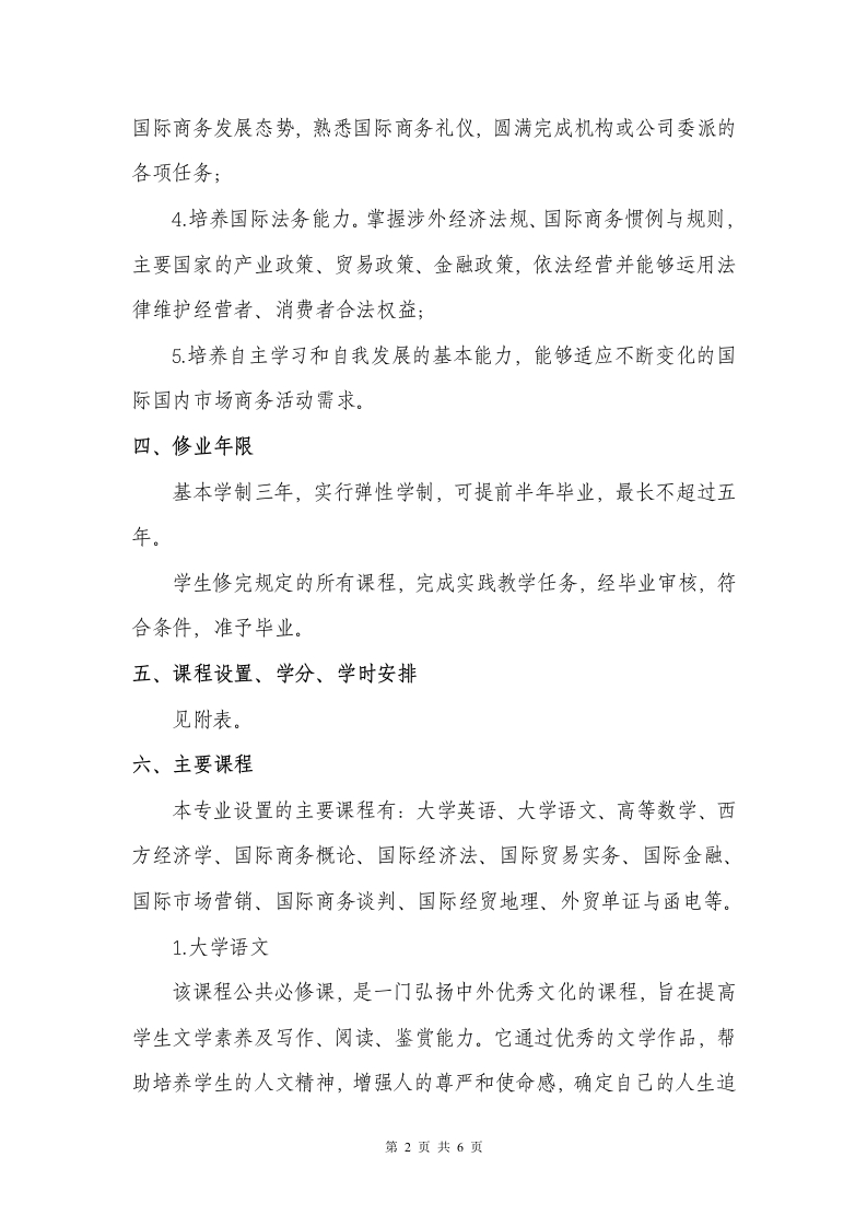 丽水学院国际商务专业(专升本函授)人才培养方案一、专业名称、层次专业名称:国际商务层次:专升本二、培养目标本专业培养具备人文精神、科学素养和诚信品质,具备经济、管理、法律和国际商务方面的知识能力,具备国际商务沟通与拓展能力、跨文化管理与交流能力、国际市场营销能力,具备自主学习与发展能力,能在国际组织、政府管理机构、涉外商务公司和跨国公司从事商务代表、国际商务活动策划、国际商务谈判、贸易信息沟通、对外投资策划与执行等业务及管理工作的复合型、实战型的商务人才。三、基本要求本专业学生主要学习国际化经营及经济管理等方面的基本理论和基本知识,掌握国际商务理论和实务,具备优良的素质结构、能力结构和知识结构。毕业生应获得以下几个方面的知识和能力:1.掌握经济学、管理学、法学以及国际商务的基本理论和基本知识;2.掌握文献检索、资料收集的基本方法;掌握国际商务的定性、定量等分析方法:3.培养国际商务沟通与拓展能力。能够运用所学的专业知识和技能,现代信息技术从事国际商务、经营管理和跨文化交流活动,掌握第1页共6页